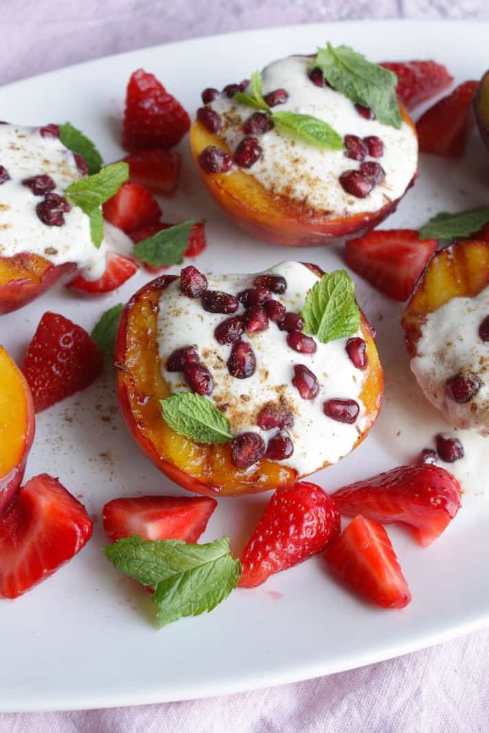 Lieve zomer met je zoete fruit, wat hou ik toch van je. Vooral je perziken, ik kan er geen genoeg van krijgen. Tijdens een van mijn wekelijkse bezoekjes aan Pinterest viel mijn oog op een ultiem zomers dessert van Scandi Foodie. Gegrilde perziken met yoghurt, granaatappel en munt. Ik dook de keuken in, deed nog een beetje van dit en van dat en daar was het dan. Een schaal vol sappige gegrilde perziken, een yoghurt-mascarpone room (ik kon het niet laten!) met vanille en een snufje kaneel. Dit kun je trouwens ook prima als ontbijt eten, bedenk ik me nu. Misschien dan alleen met yoghurt. Of niet. Kijk maar even waar je zin in hebt 😉