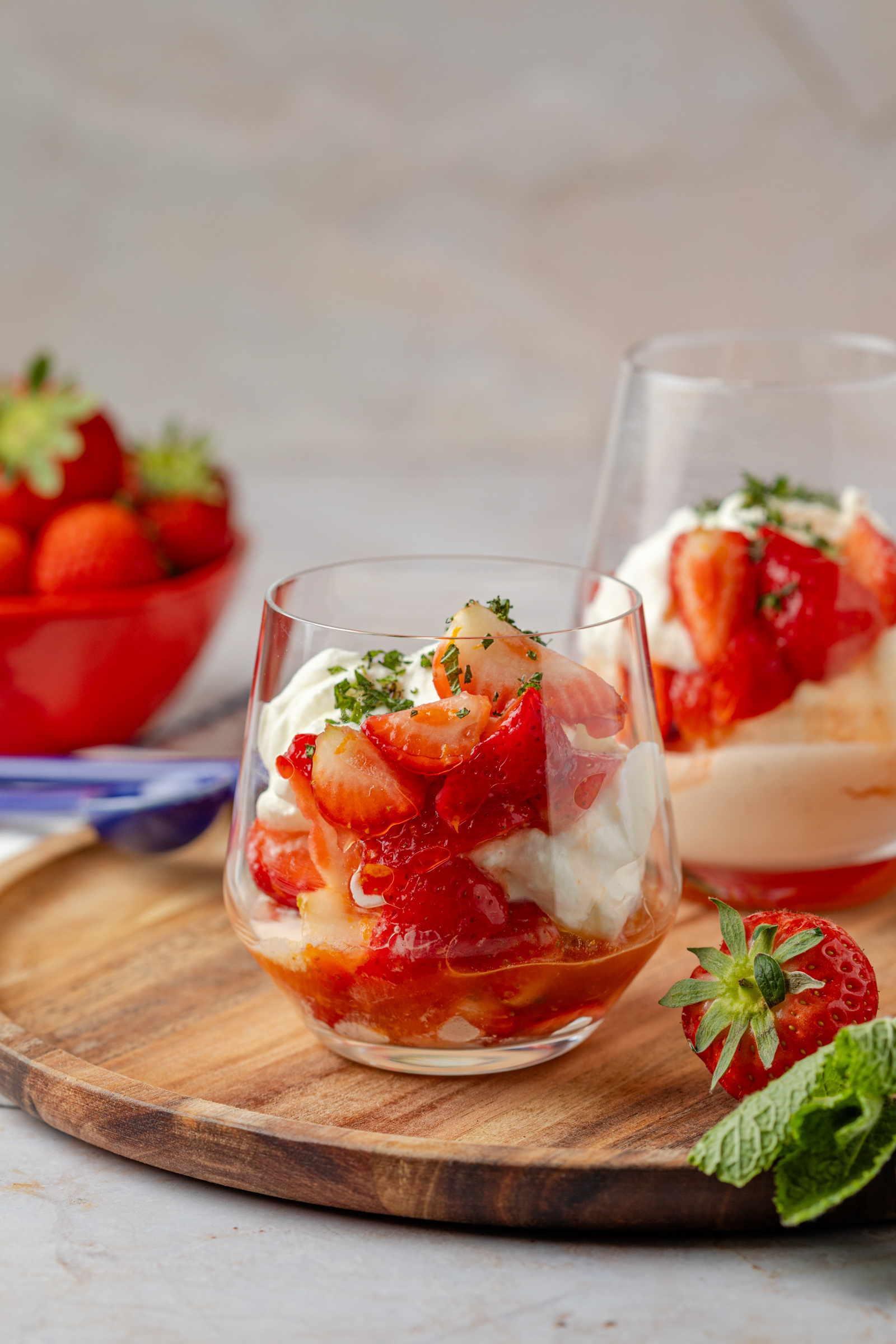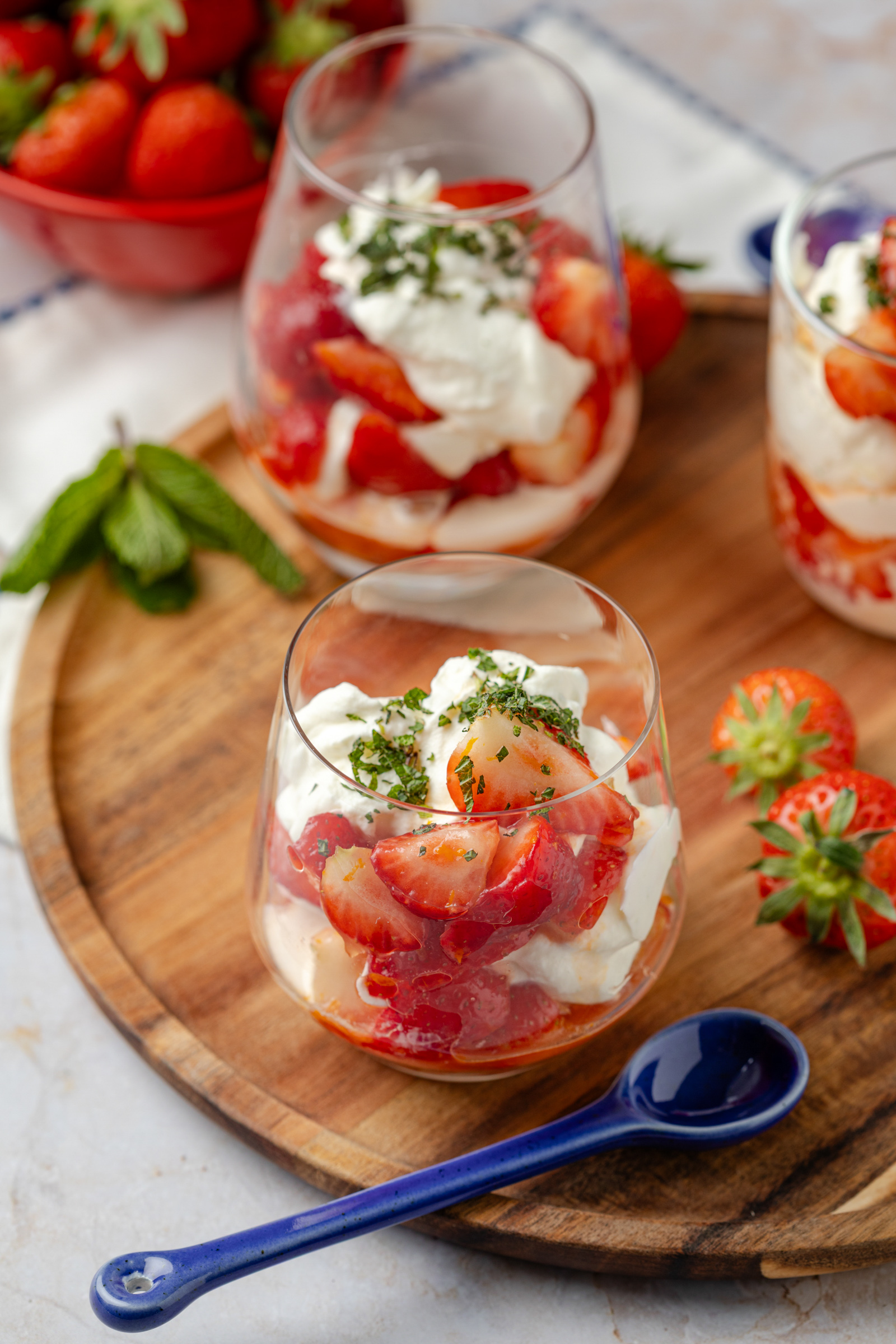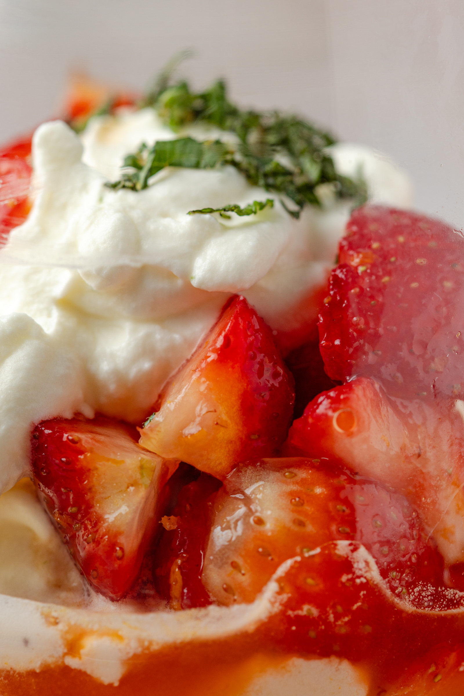 De aardbeien marineer ik sinaasappelrasp- en sap, vanille extract en een scheutje aardbeiensiroop. Maar als de aardbeien echt heel zoet zijn, kun je de siroop ook achterwege laten. En limoenroom is wat mij betreft een van de lekkerste bereidingen van opgeklopte room. Ik voeg een klein beetje poedersuiker toe voor een licht zoetje, maar het blijft subtiel. Vooral de limoensmaak overheerst en die kun je zo intens maken als je zelf wilt. Let wel op dat citrus je opgeklopte room kan laten schiften als je deze voorbereidt. Dus als je de slagroom eerder wilt kloppen en bewaren in de koelkast, voeg dan nog geen limoen toe. Voeg dit pas toe vlak voor het serveren (klop ‘m dan nog even door).
