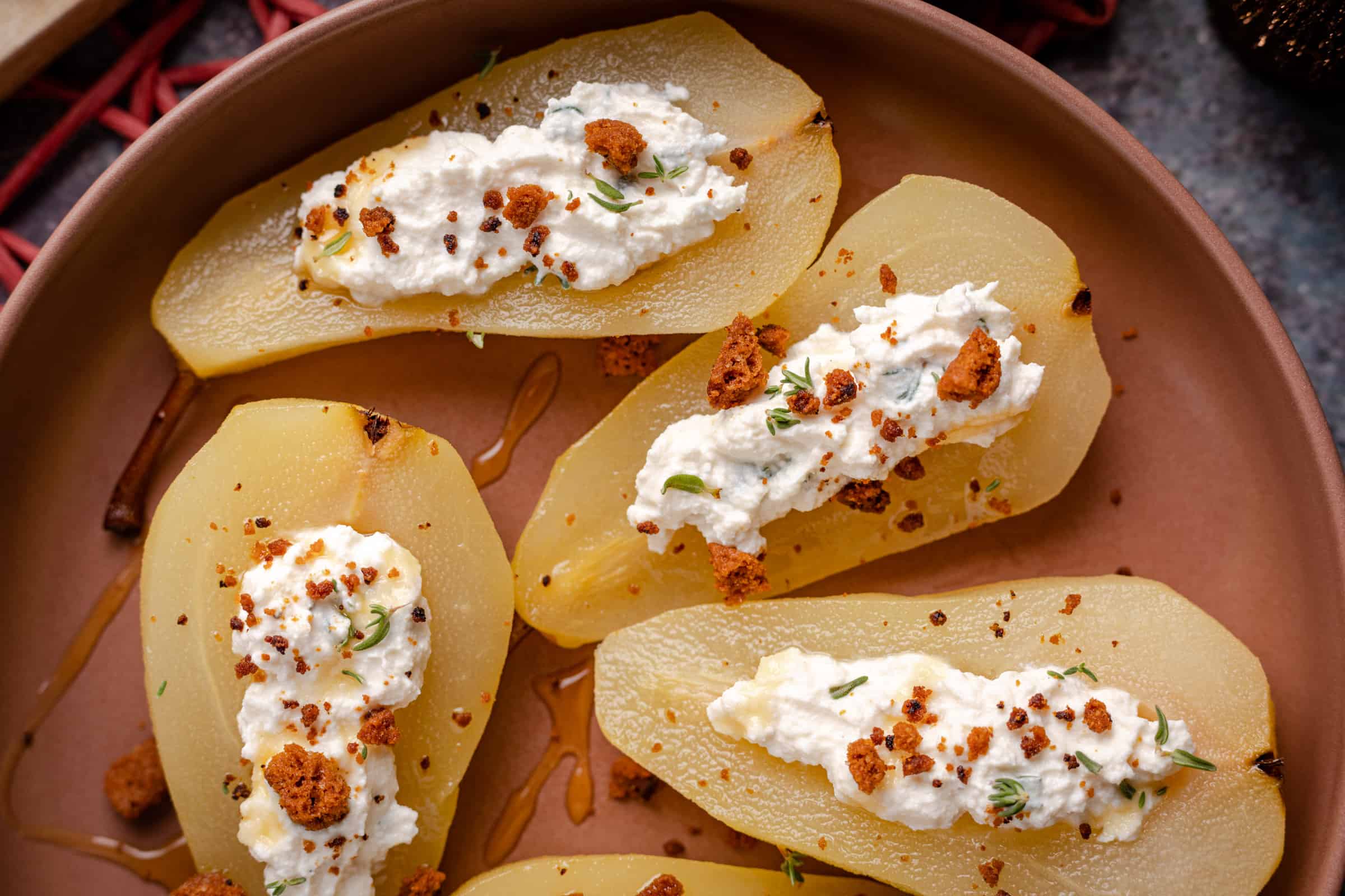 De peren laat je eerst rustig pocheren met suiker, citroen en diverse specerijen. Daarna hoef je ze alleen nog maar te vullen met het mengsel van ricotta, tijm en honing. Nog wat krokant gebakken koekkruimels erover voor een lekkere crunch en je hebt een heerlijk nagerecht.