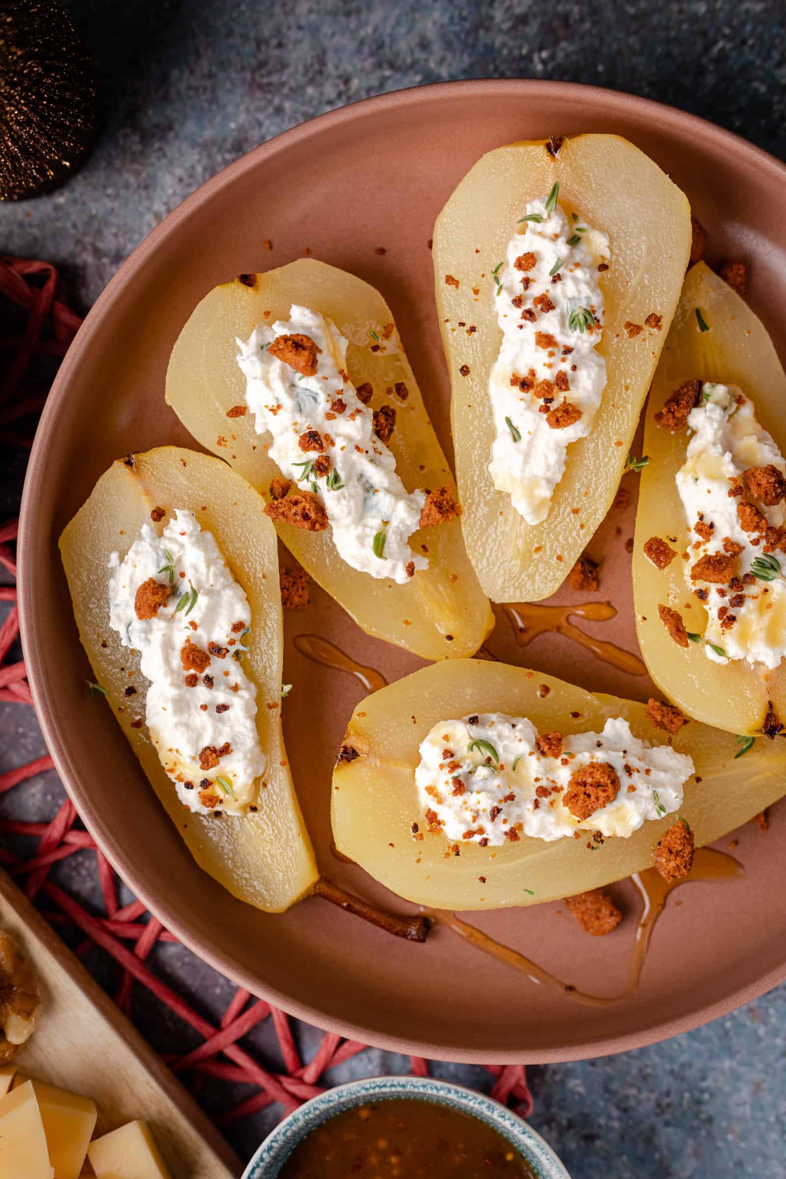 De peren laat je eerst rustig pocheren met suiker, citroen en diverse specerijen. Daarna hoef je ze alleen nog maar te vullen met het mengsel van ricotta, tijm en honing. Nog wat krokant gebakken koekkruimels erover voor een lekkere crunch en je hebt een heerlijk nagerecht.