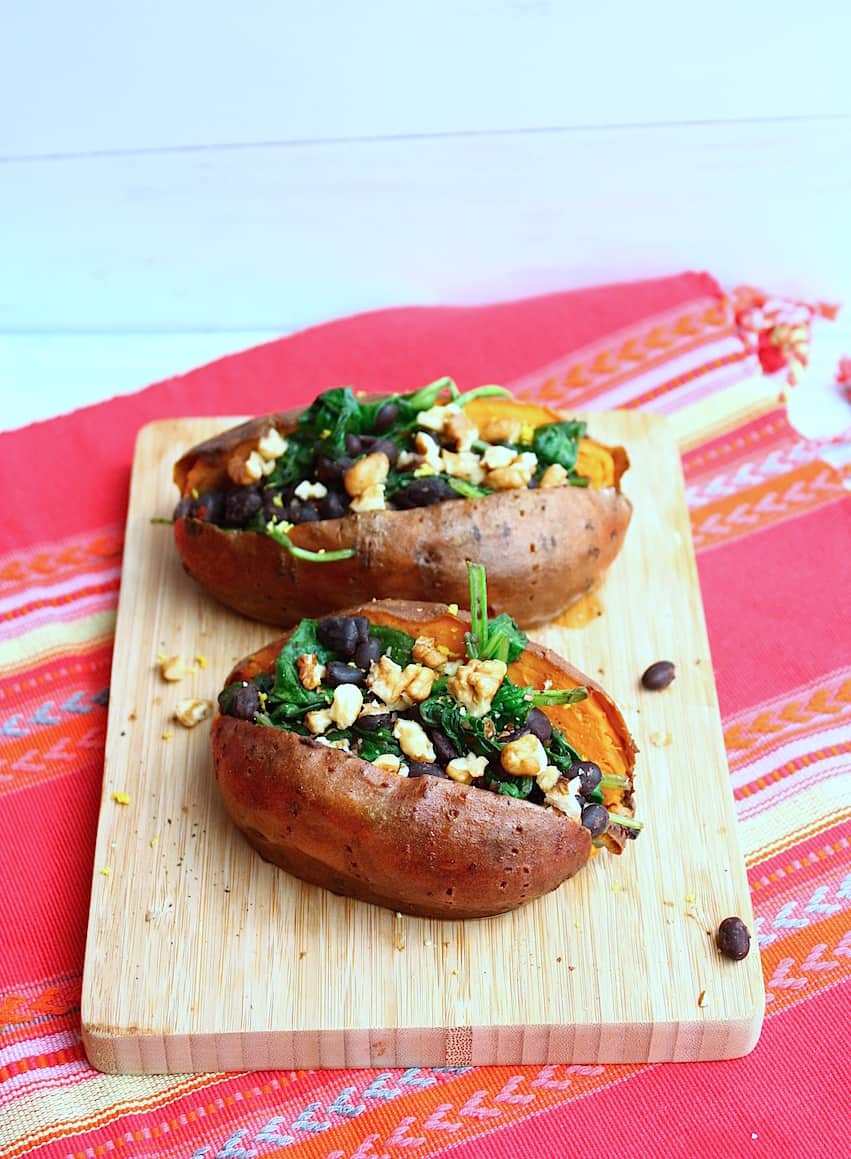 Wat een feestelijke week is het. Natuurlijk omdat onze nieuwe website eindelijk live is én niet te vergeten de Eetkalender 2017 is uit. Een mooi moment om een van de 200+ nieuwe recepten hieruit met jullie te delen en dat is deze gepofte zoete aardappel met bonen en spinazie.