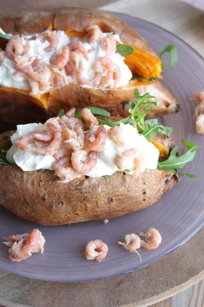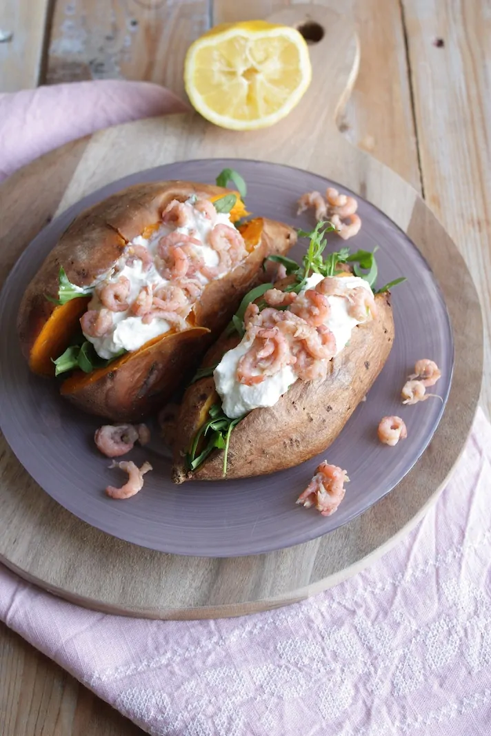 Als je nog nooit een zoete aardappel hebt gepoft dan wordt het echt hoognodig tijd. Want dit is wat mij betreft een van de beste dingen die je met een zoete aardappel kunt doen. Naast frietjes maken en pureren. Ach, eigenlijk is alles met een zoete aardappel heerlijk. Dit gerecht met gepofte zoete aardappel en Hollandse garnalen ontstond per ongeluk. Ik had nog 2 zoete aardappels over en ik nam Hollandse garnalen bij de visboer mee omdat ik er zin in had. En dat was voldoende inspiratie voor dit heerlijke gerechtje. Lekker bij een gebakken stukje vis of met een salade erbij. Of alleen deze als een makkelijke maaltijd doordeweeks. Alhoewel je wel even tijd moet uittrekken voor het poffen, dat dan weer wel. Maar ja, in die tijd kun je even een wasje doen, of de vaatwasser uitruimen, beetje Facebooken en Twitteren, spelen met je kinderen, etc. Genoeg te doen dus 😉