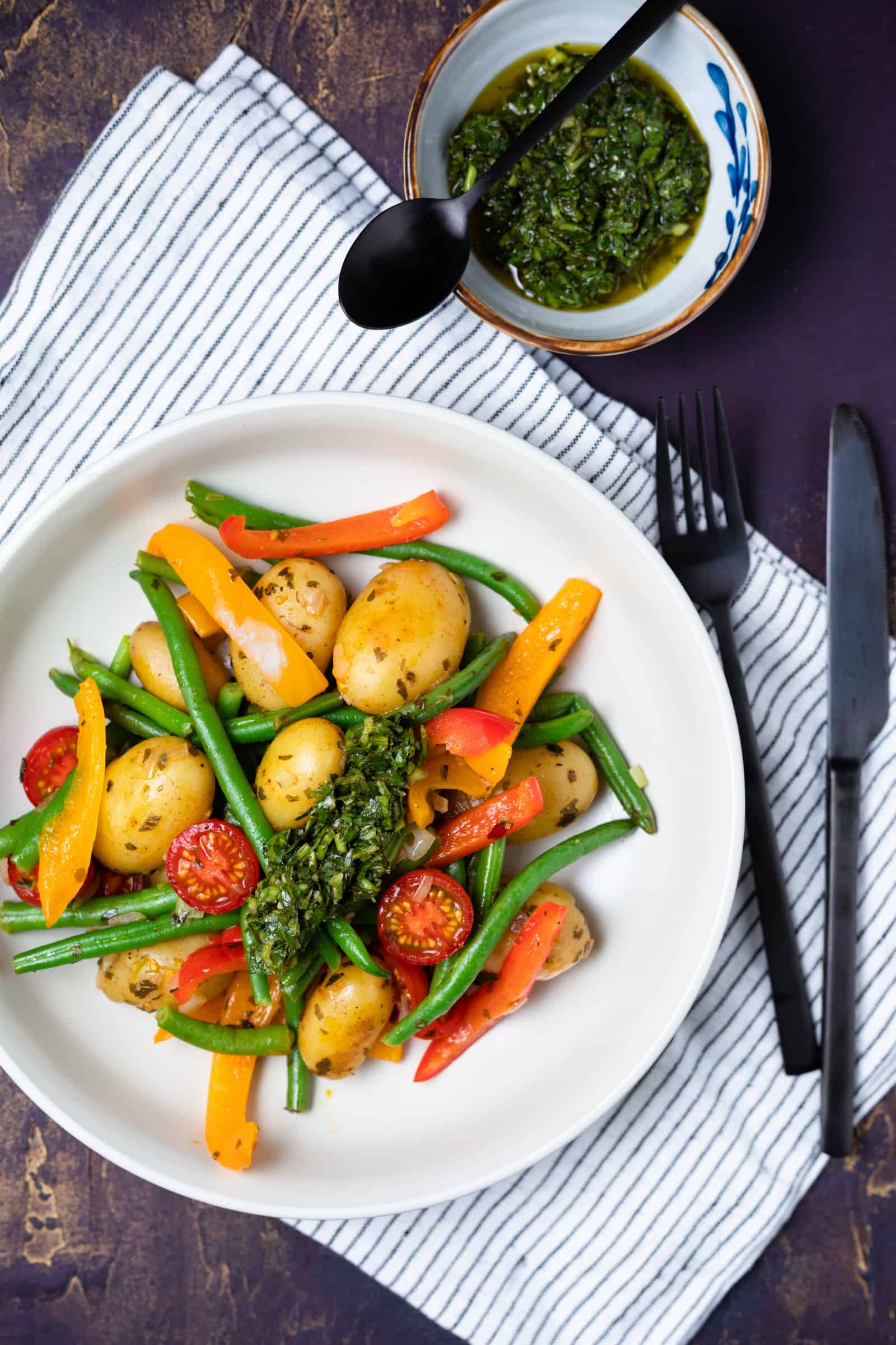 In het recept voor mijn geroerbakte sperziebonen met krieltjes dat ik vandaag met jullie deel zit zeker 800 gram groente en die combineer ik met gekookte krieltjes en zelfgemaakte gremolata van peterselie, citroen en knoflook. Deze geeft het gerecht een heerlijk kruidige kick met een fris zuurtje. Een smaakbom op je bord en ook nog eens volledig plantaardig. Kom, we gaan koken.