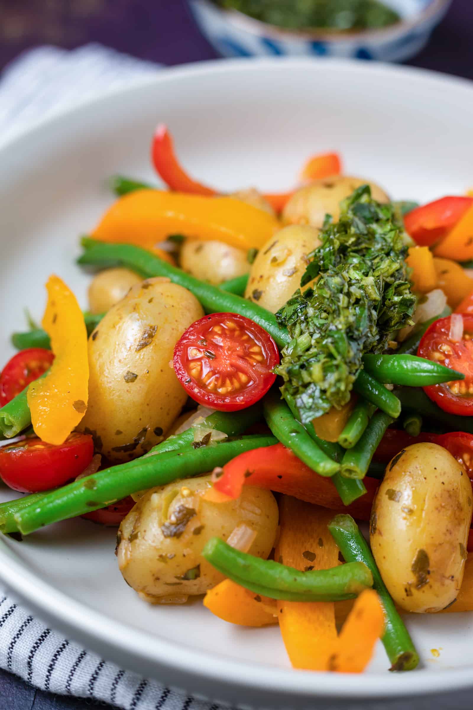 Sperziebonen, ik ben er dol op! Vooral als ze geroerbakt zijn, want zo blijven ze nog een beetje knapperig. Ook buiten het seizoen eet ik ze gewoon, maar dan uit de diepvries. Vandaag heb ik een heerlijk recept voor jullie: mijn geroerbakte sperziebonen met krieltjes, paprika, cherrytomaten en frisse gremolata. Waar je ook nog eens zo mee klaar bent.