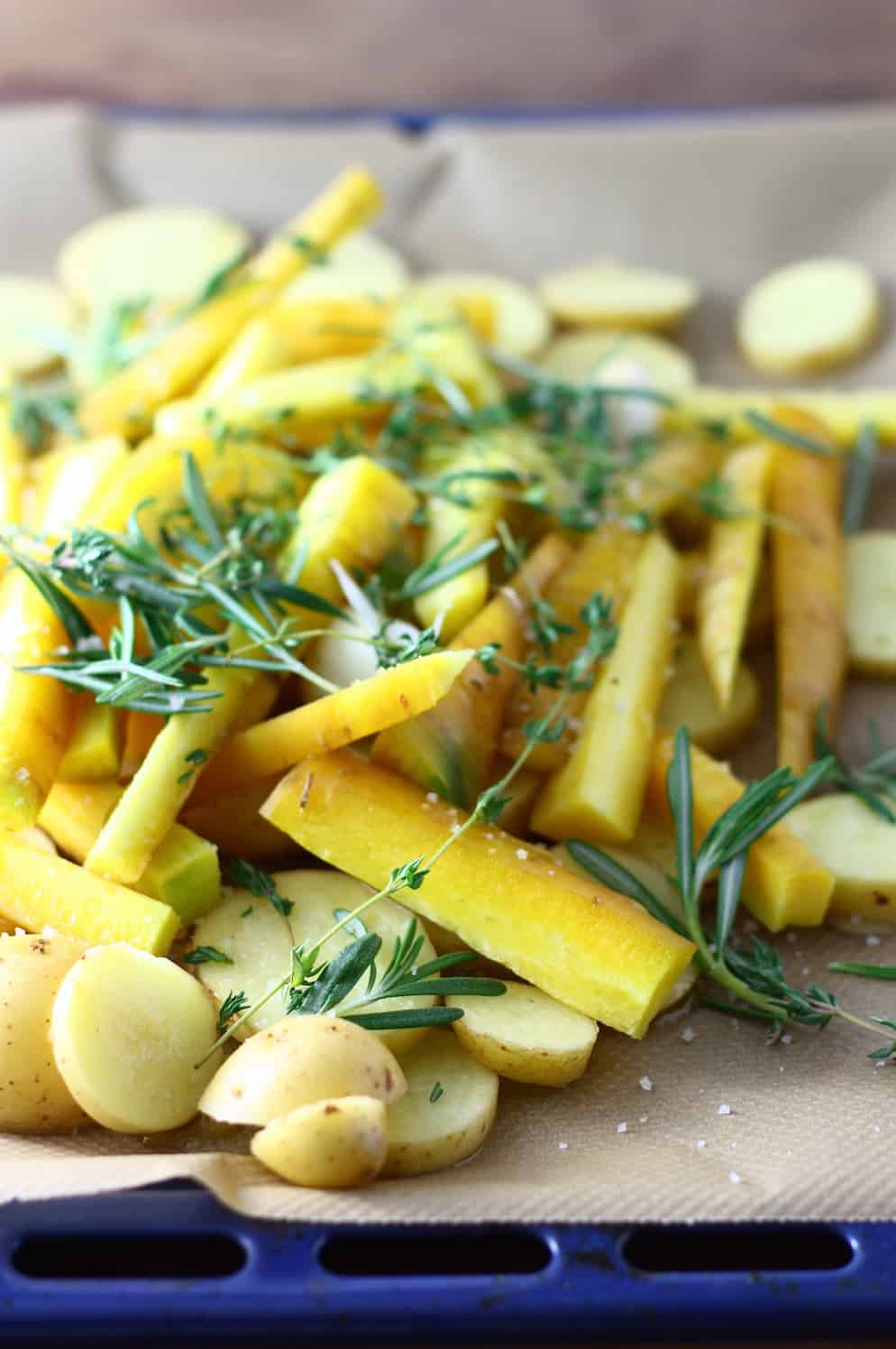 4. Zet het bakblik in de oven en rooster 40 – 45 minuten tot de aardappels en wortels gaar en goudbruin zijn geworden. Schep om het kwartier even om.