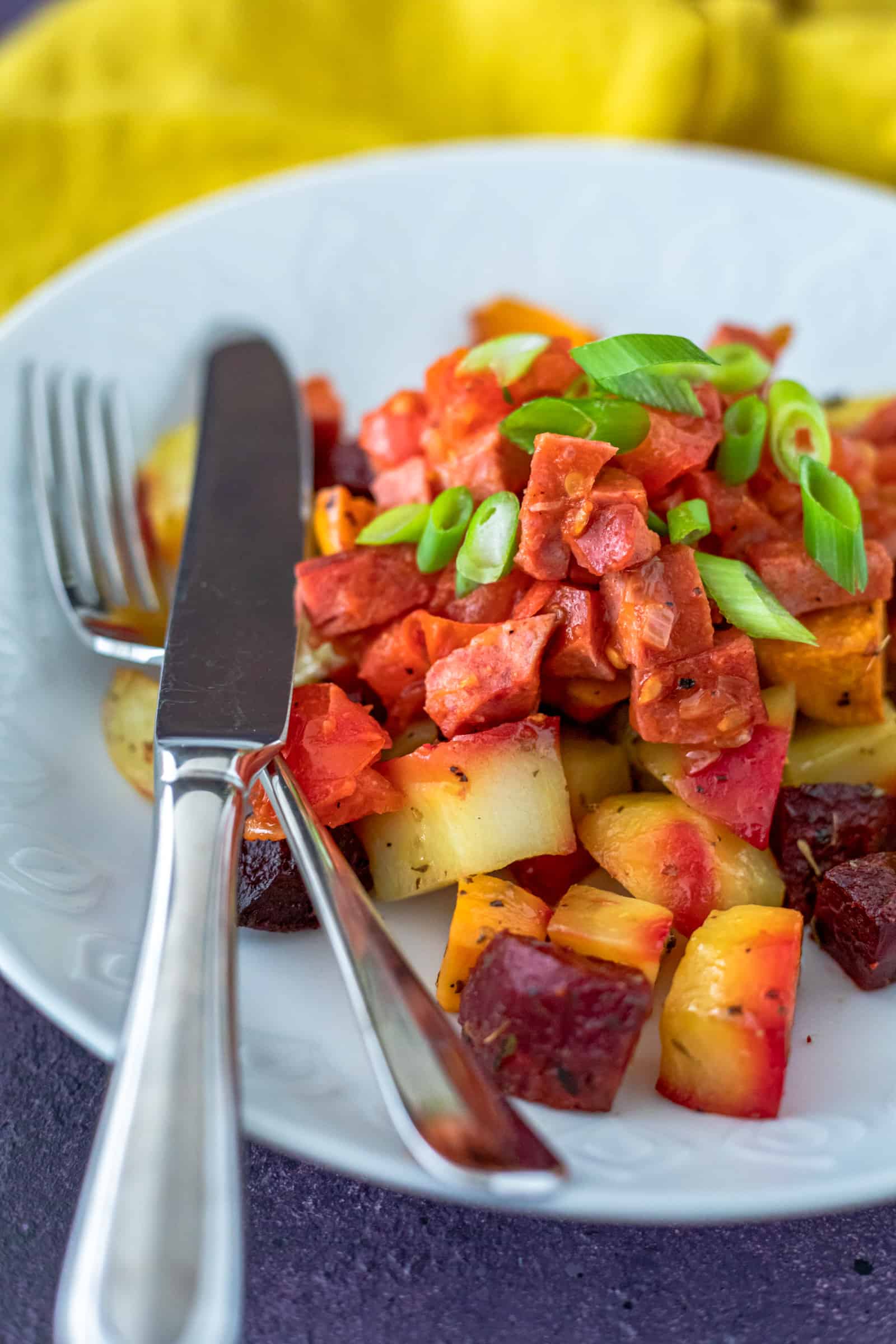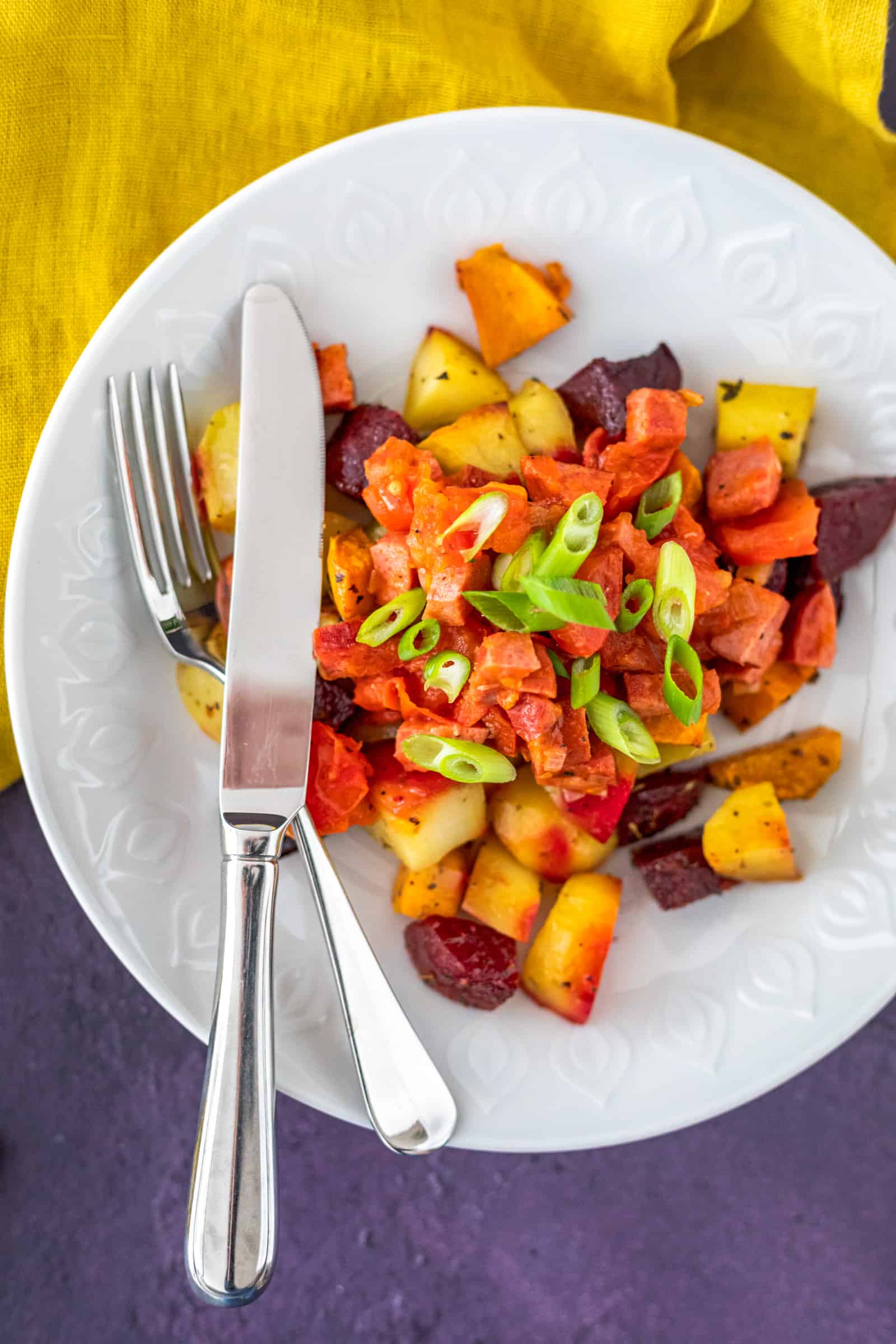 Vandaag deel ik met jullie dit nieuwe recept voor een AVG’tje, maar dan wel met een Francesca twist! Ik ben dol op de combinatie van biet en rookworst en die heb ik mooi samengebracht met geroosterde aardappel in dit gerecht. De aardappels en bieten worden geroosterd in de oven. En terwijl dat gebeurt, bak je de rookworst uit in een pan. Daar gaat nog wat tomaat, lente-ui en zwarte peper bij en daarna kun je al aanvallen. Een heerlijk simpel en smakelijk gerecht voor doordeweeks!