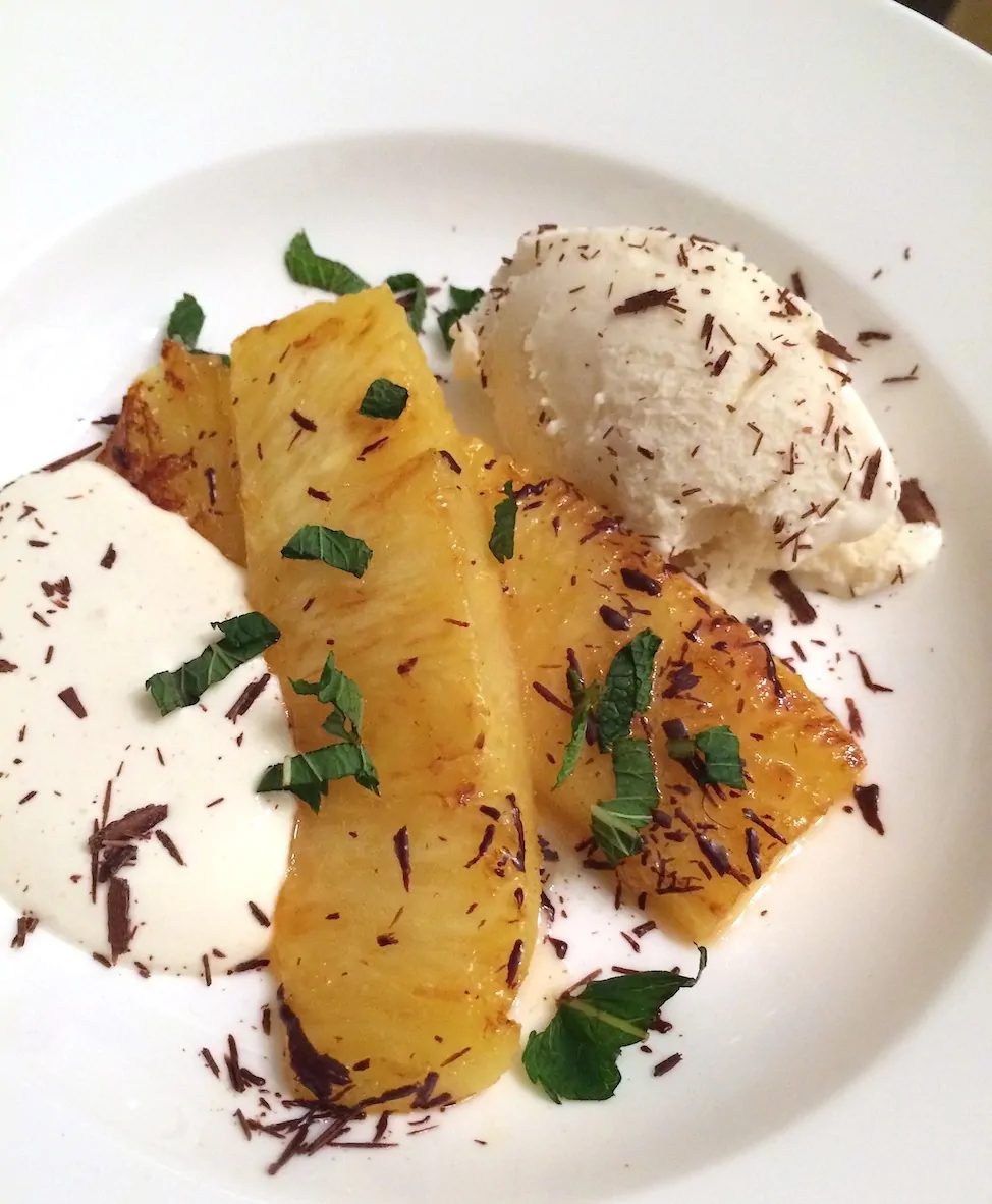 In de categorie desserts is deze geroosterde ananas met vanilleroom voor mij een van de grootste verwennerijen. Het heeft niets met gezond eten te maken, maar je wordt er wel gelukkig van. Een ananas die even geroosterd is en nog warm van binnen is ultiem genieten. En ook nog eens heel makkelijk te maken. Je kunt de ananas in een grillpan of op de BBQ roosteren. De vanilleroom maak je van tevoren en het ijs haal je uit de diepvries. Comfort dessert pur sang en je tovert het in een handomdraai op tafel.