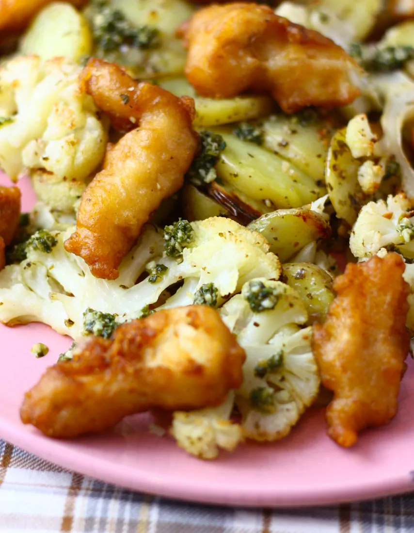 Verwarm de oven voor op 200 graden. Snijd de bloemkool in grote plakken en de aardappels in plakjes. Pak een grote ovenschaal en doe daar de bloemkool en aardappel in. Schep de pesto erbij en schenk er een scheutje olijfolie over. Meng dit alles goed met je handen en verdeel gelijkmatig over de schaal. Zet daarna in de oven en bak 35-40 minuten totdat de bloemkool bruine randjes krijgt. Verdeel de stukken kibbeling erover en bak nog ongeveer 5 minuten mee (hoeft alleen warm te worden).