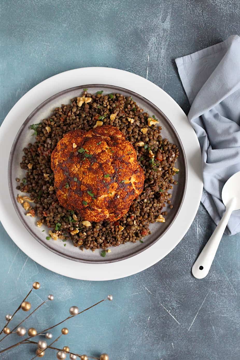 Bloemkool leent zich uitstekend om langzaam te garen in de oven en krijgt daardoor een heerlijke smaak. Voor deze geroosterde hele bloemkool gebruikte ik diverse specerijen zoals kardemom, paprika en piment met olie en tomatenpuree. En daarna deed de oven de rest van het werk. Voor de linzensalade stoofde ik de linzen in bouillon en mengde ze daarna o.a. met walnoten.