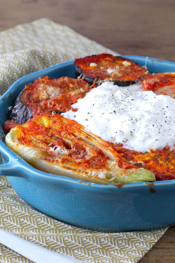 - Pak nu een ovenschaal (hoeft geen hele grote te zijn) en bedek de bodem met saus tot deze net aan bedekt is. Maak vervolgens een laagje met de venkel en aubergine en dek af met wat geraspte pecorino en wat peper en zout. Herhaal deze stappen (saus, groenten, kaas, peper en zout) totdat alle ingrediënten op zijn, verwerk ook de grove stukken paprika. Zet het geheel voor zo’n 20-25 minuten in de oven totdat de groenten zacht zijn en de kaas goed gesmolten.