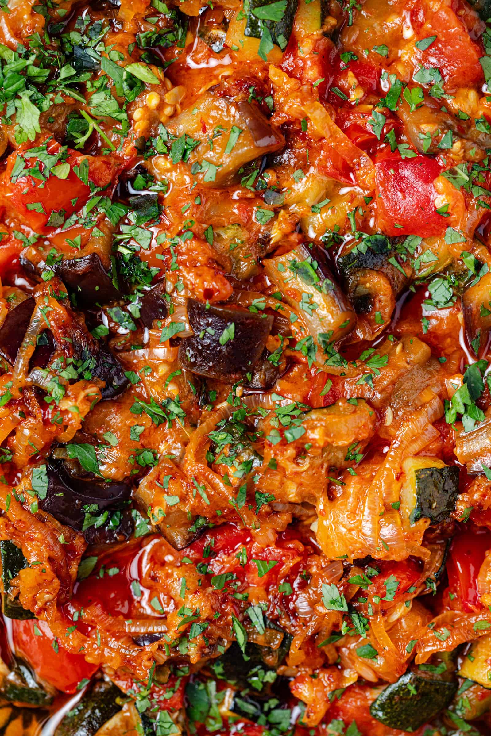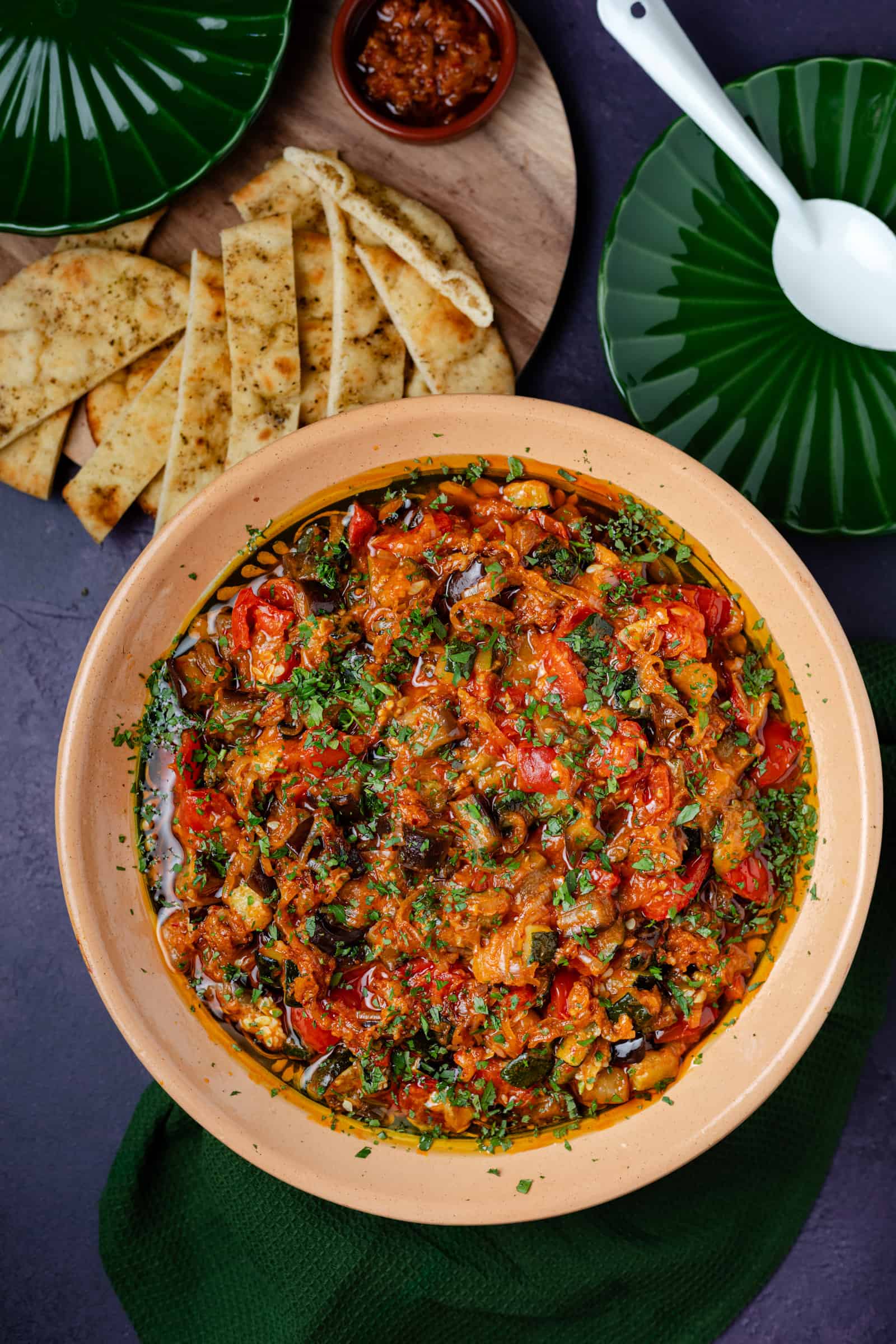 Soms neem je een hap van iets en daarna kun je niet meer stoppen met eten. Dat overkomt me eigenlijk vrij vaak, maar toen ik plaats nam aan de eettafel van Hilal, beter bekend als Moons Kitchen, was ik verloren. Alles wat op tafel stond was buitengewoon lekker, maar haar geroosterde groenten, die zwommen in een waanzinnig smakende olie, betoverden me. Eigenlijk waren haar groenten niet geroosterd, maar gefrituurd. Waarna ze belandden in de olie. Verder weet ik ook niet precies hoe ze het maakte, maar de combinatie van de zachte groenten met tomaat en de kruidige olie bleven in mijn smaakherinnering rondzwerven waardoor ik er wel mee aan de slag moest.