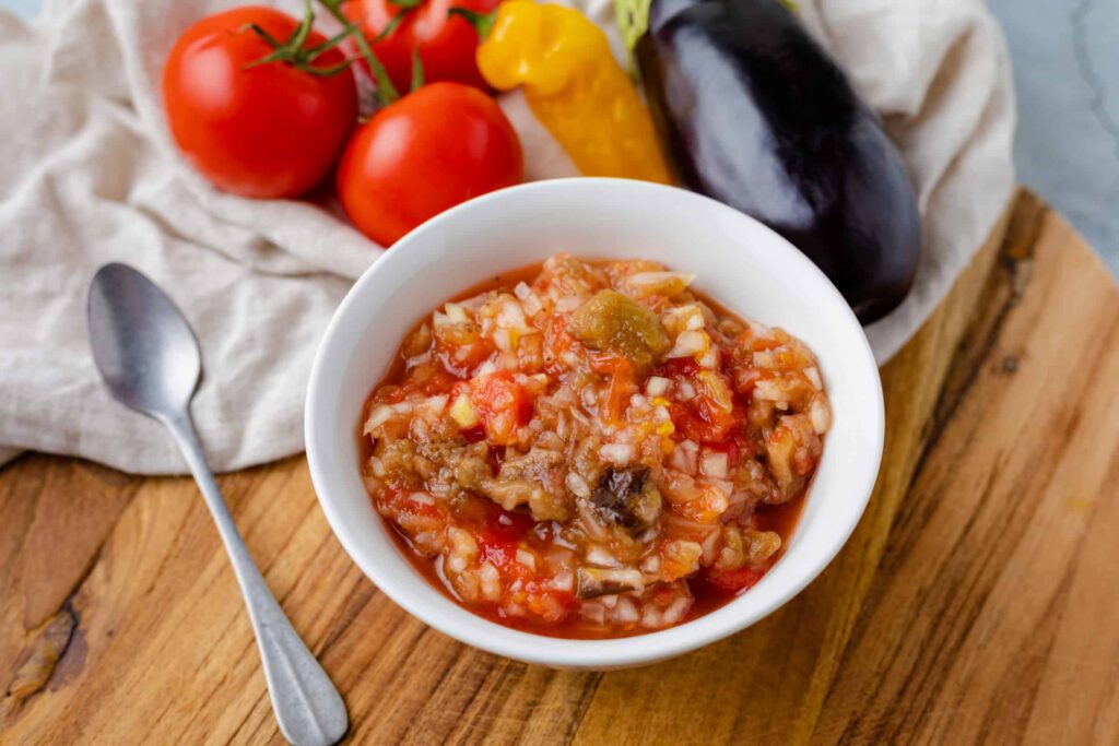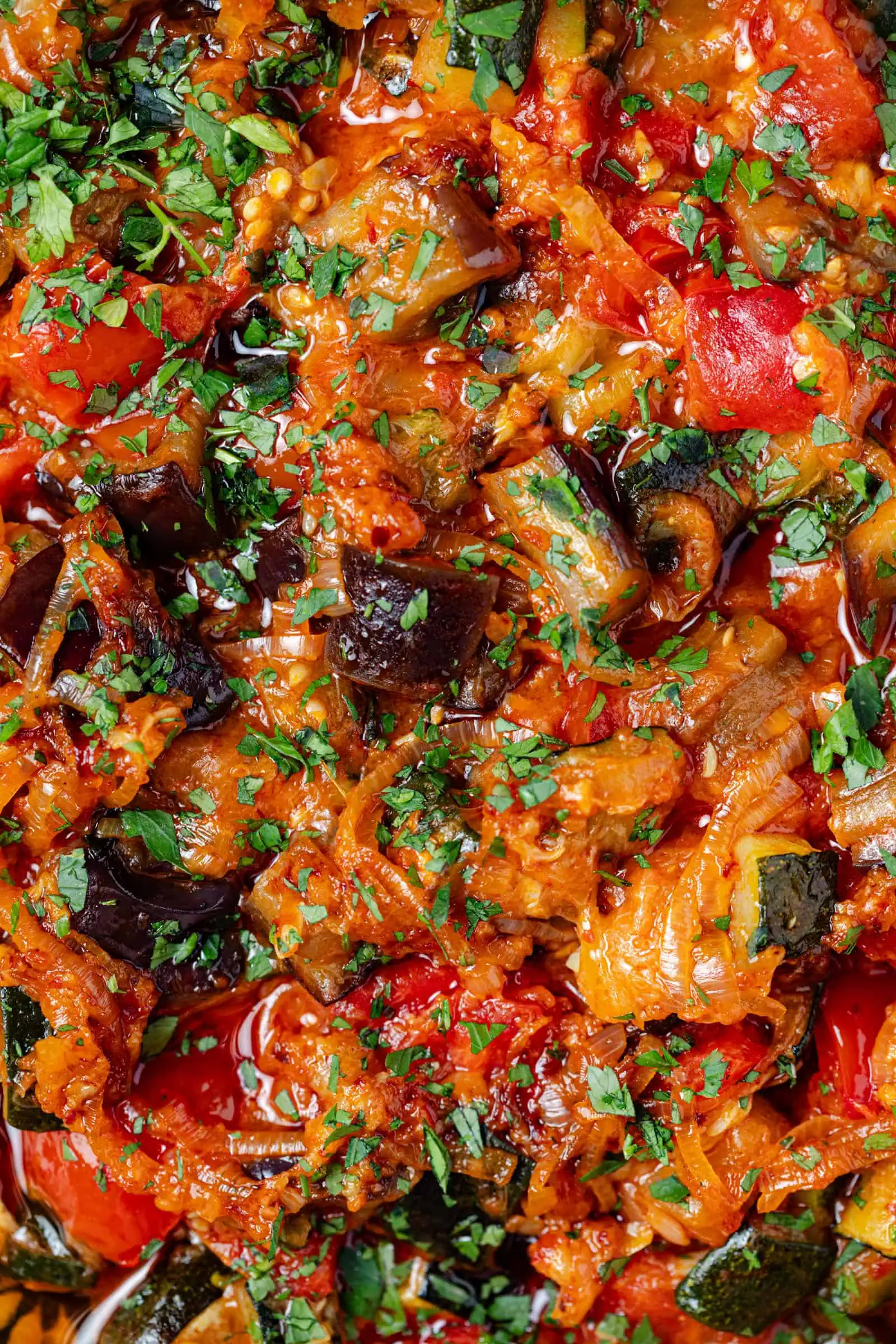 - Als de geroosterde groenten klaar zijn, schep je ze rustig door het tomaten-sjalotmengsel heen. De zachte knoflook duw je uit de schilletjes en klop je los met een scheutje olijfolie, voeg dit ook toe. Laat de groenten nog 10 minuten op laag vuur pruttelen zodat de smaken samen komen. Proef en voeg naar wens nog extra pul biber en/of zout toe.