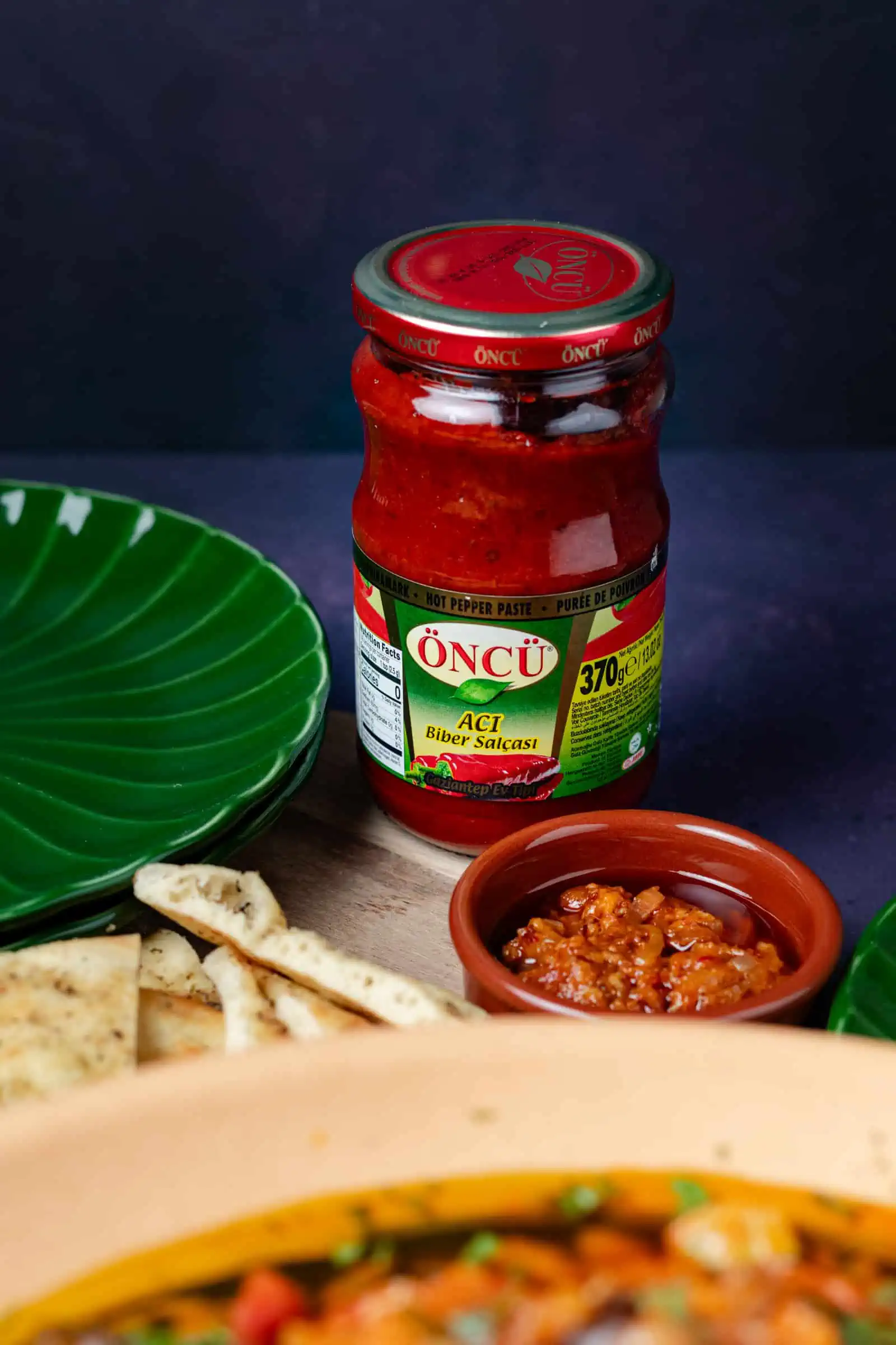 Verder gebruik ik nog twee ingrediënten die je misschien nog niet kent. De eerste is Turkse peperpuree, biber salçasi, die wordt gemaakt van milde/zoete rode pepers met een beetje olie en zout. Er zijn twee versies van: tatli (zoet) en aci (pittig), deze laatste wordt gemaakt met pittige rode pepers. Ik heb zelf altijd een pot met tatli biber salçasi in de koelkast staan en ik gebruik het als tomatenpuree en voeg geregeld een flinke eetlepel ervan toe aan gerechten zoals soepen, linzenstoof, vleesstoof en geroosterde groenten voor een umamismaak. Ik koop het altijd van het merk Öncü en die vind je in ieder geval bij de Turkse/Mediterraanse supermarkt, maar ook steeds vaker bij reguliere supermarkten. Zelf maken kan ook, maar heb ik nog niet gedaan. Gaat vast een keer gebeuren in de toekomst ;-).