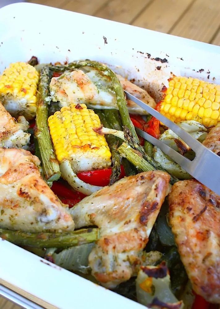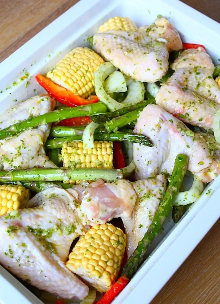 Trek de buitenbladeren van de maiskolven af en hak ze in tweeën. Snijd de onderkanten van de asperges en de paprika en venkel in grove reepjes. Schep alle groenten in de schaal erbij en schenk de andere helft van de marinade erover. Smeer wederom goed in en hussel alles goed door elkaar. Zorg ervoor dat de kip zoveel mogelijk onbedekt is.