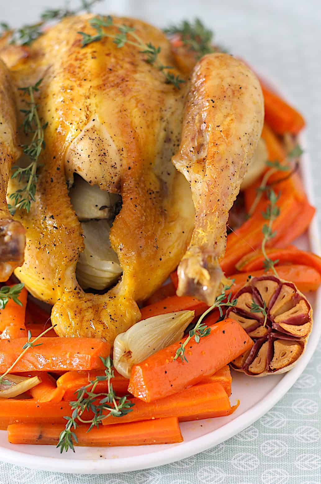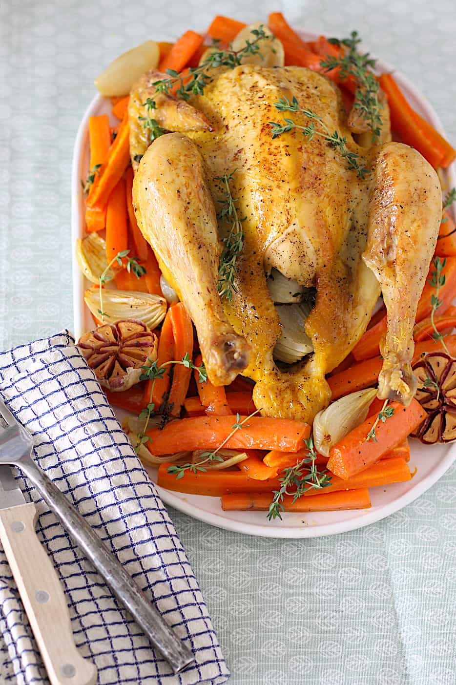 6. Leg de kip op een grote schaal en leg alle groenten rondom. Haal de ‘geroosterde’ takjes tijm ertussenuit (die zijn nu toch zwart) en garneer met een paar verse takjes voor de kleur. Serveer direct. Lekker met geroosterde aardappelen erbij, die kunnen prima tegelijkertijd in de oven.