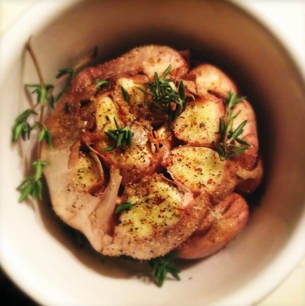 Haal de buitenste schillen van de bol knoflook af, maar zorg ervoor dat de bol intact blijft. Snijd het topje van de bol af waardoor de teentjes iets bloot komen te liggen. Zet de bol vervolgens in een klein keramieken schaaltje en bestrooi met peper, zout en de tijm. Sprenkel er wat olijfolie over en dek het schaaltje af met aluminiumfolie.