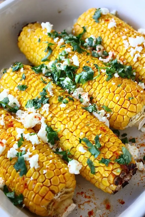We hebben een nieuwe verslaving thuis: geroosterde mais uit de oven. Meestal bereid ik de maiskolven heel basic. Even insmeren met olijfolie, bestrooien met zout en daarna 30-40 minuten roosteren in de oven op 200 graden. Onlangs had ik eters en toen maakte ik er een feestelijke versie van die net even wat meer pit had. Dit is een heerlijk bijgerecht voor 4 personen en je hebt er geen omkijken naar.