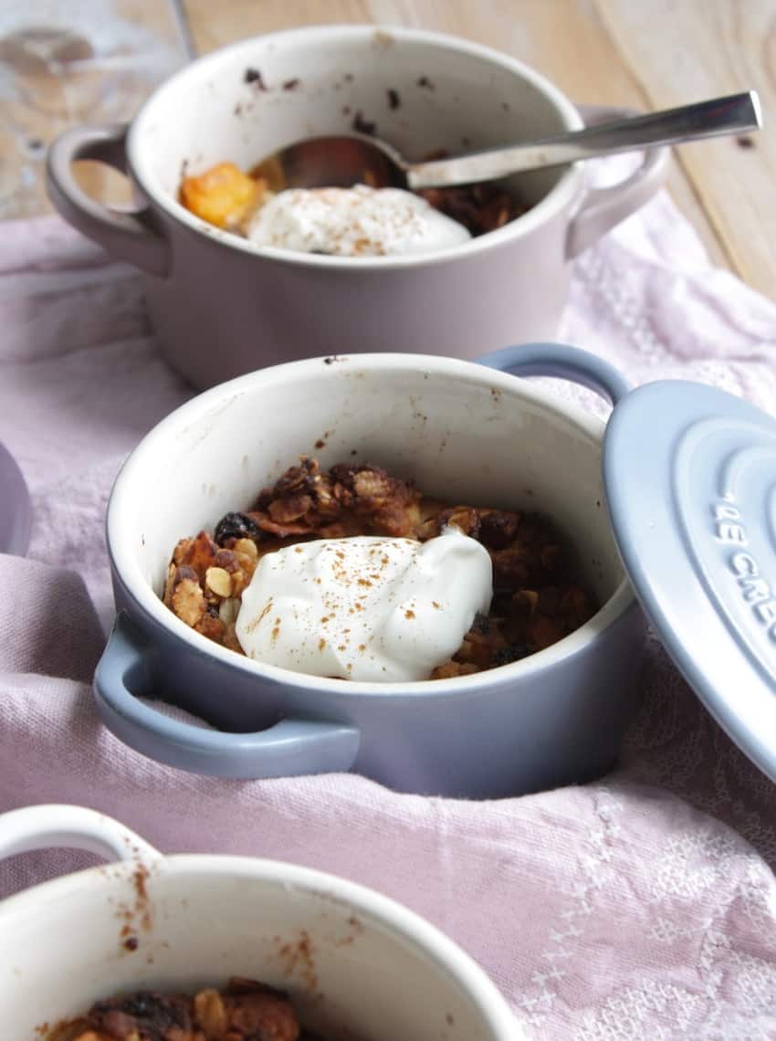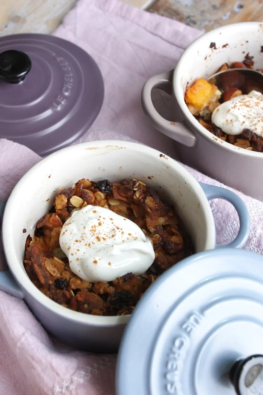 Zet de bakjes in de oven en rooster de muesli in 30 minuten mooi bruin en krokant. De abrikoos is inmiddels helemaal zacht geworden. Laat daarna afkoelen tot lauw en serveer met een flinke dot yoghurt en een snufje kaneel.