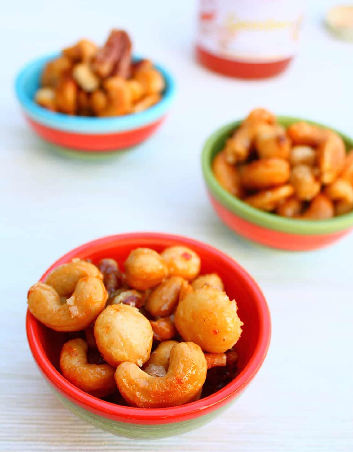 En er was ook nog een flesje ‘hot’ honing met chili en gember. Van die combinatie werd ik persoonlijk erg enthousiast. Daar kun je namelijk briljante marinades en dressings mee maken. En noten roosteren. Ja, geroosterde noten met honing! Ik dus naar mijn kaaswinkel en daar kocht ik een bakje ongezouten noten (met heel veel macademia’s erin). Het recept is ontzettend makkelijk en het resultaat is verbluffend. Een vol bakje houdt het bij ons nog geen uur uit en ik heb inmiddels al een keer of 4 de oven aangezet voor een nieuwe voorraad.
