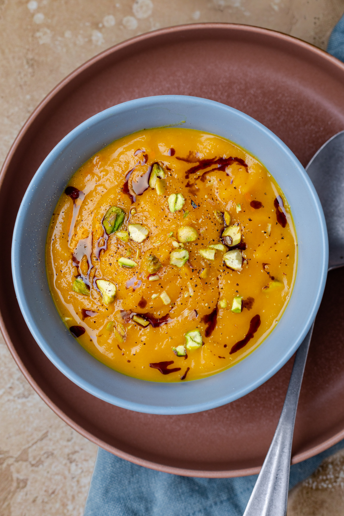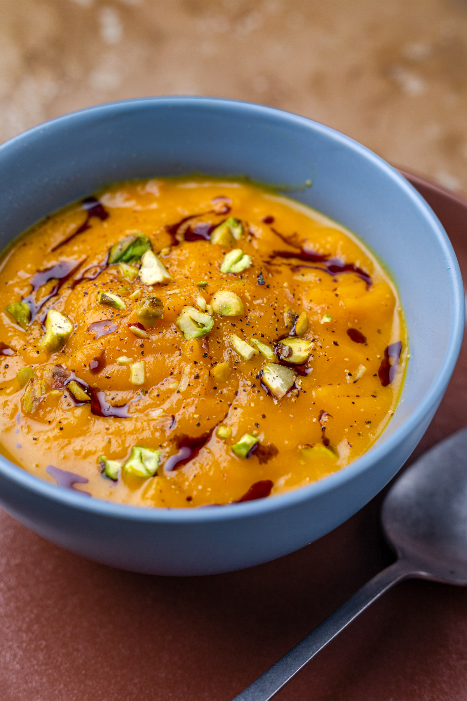 - Serveer de romige pompoensoep in kommen en garneer met de pistachenoten, druppeltjes pompoenpitolie en nog wat gemalen zwarte peper. Of ga voor een van je andere favoriete toppings.