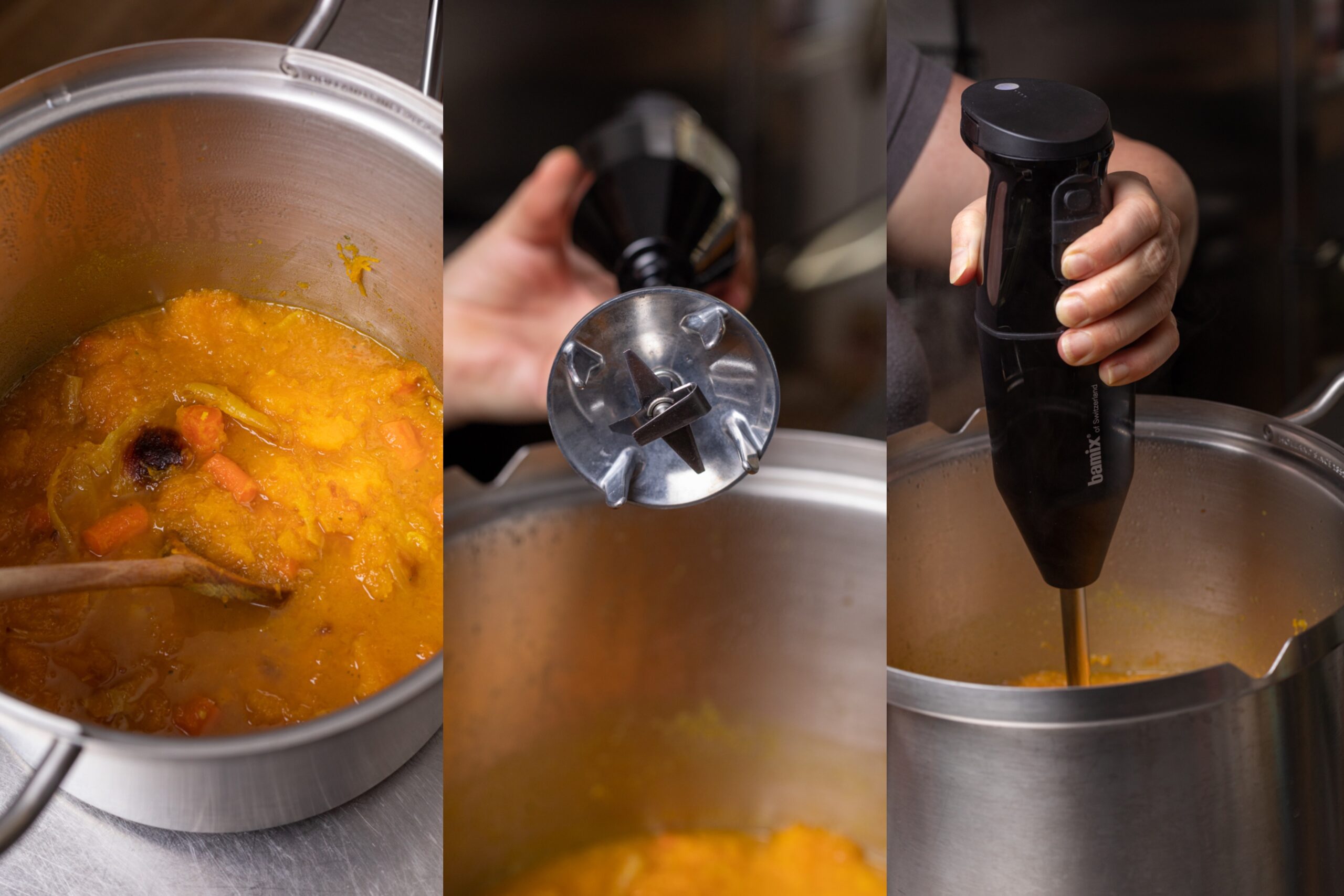 - Pak de bamix erbij, houd de pan iets schuin en plaats ‘m in de pan. Zet de bamix aan op de standaard stand (II) en binnen 1 minuut heb je een romige pompoensoep. Proef en breng verder op smaak met zwarte peper en eventueel extra zout naar smaak.