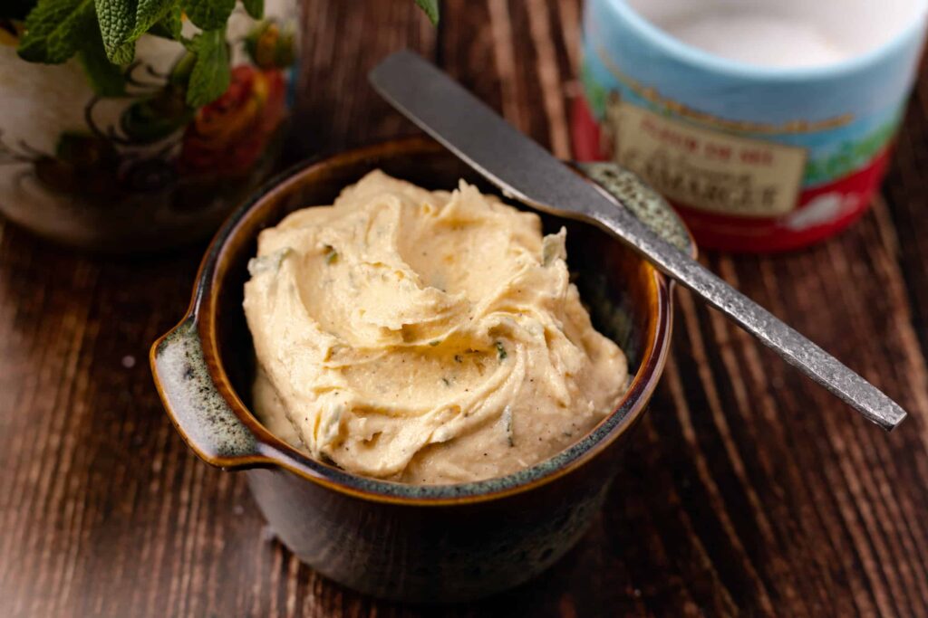 - Tip: De kip wordt al ziltig van zichzelf door het pekelbad. Maar als je niet pekelt dan moet je een flinke snuf zout toevoegen aan de kruidenboter.