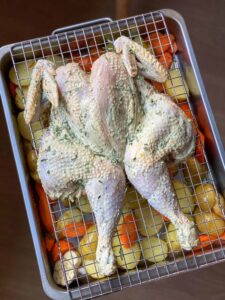 - Leg de kip op het rooster boven je aardappels en wortels of leg ‘m rechtstreeks erop in het bakblik (als je geen rooster hebt).
