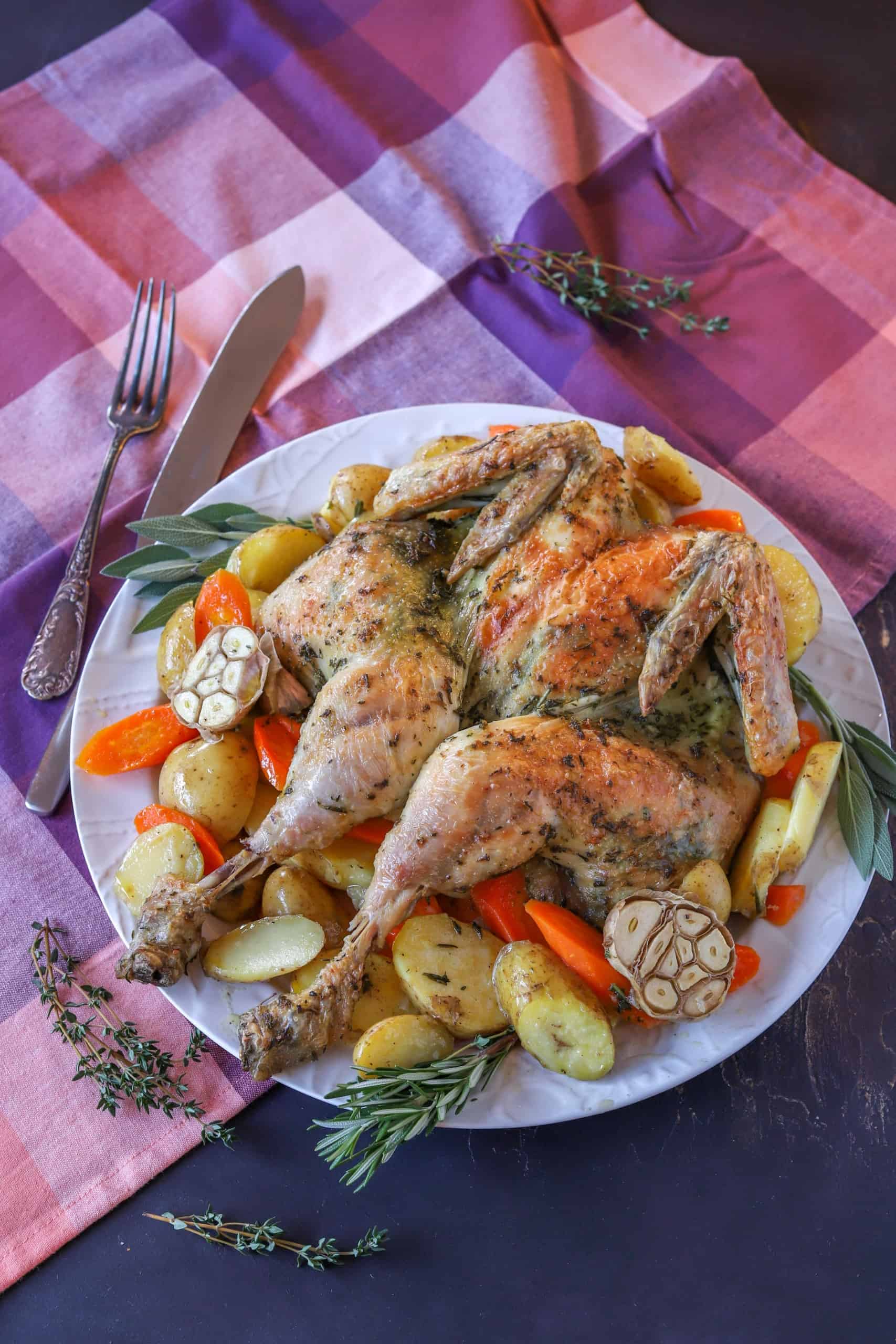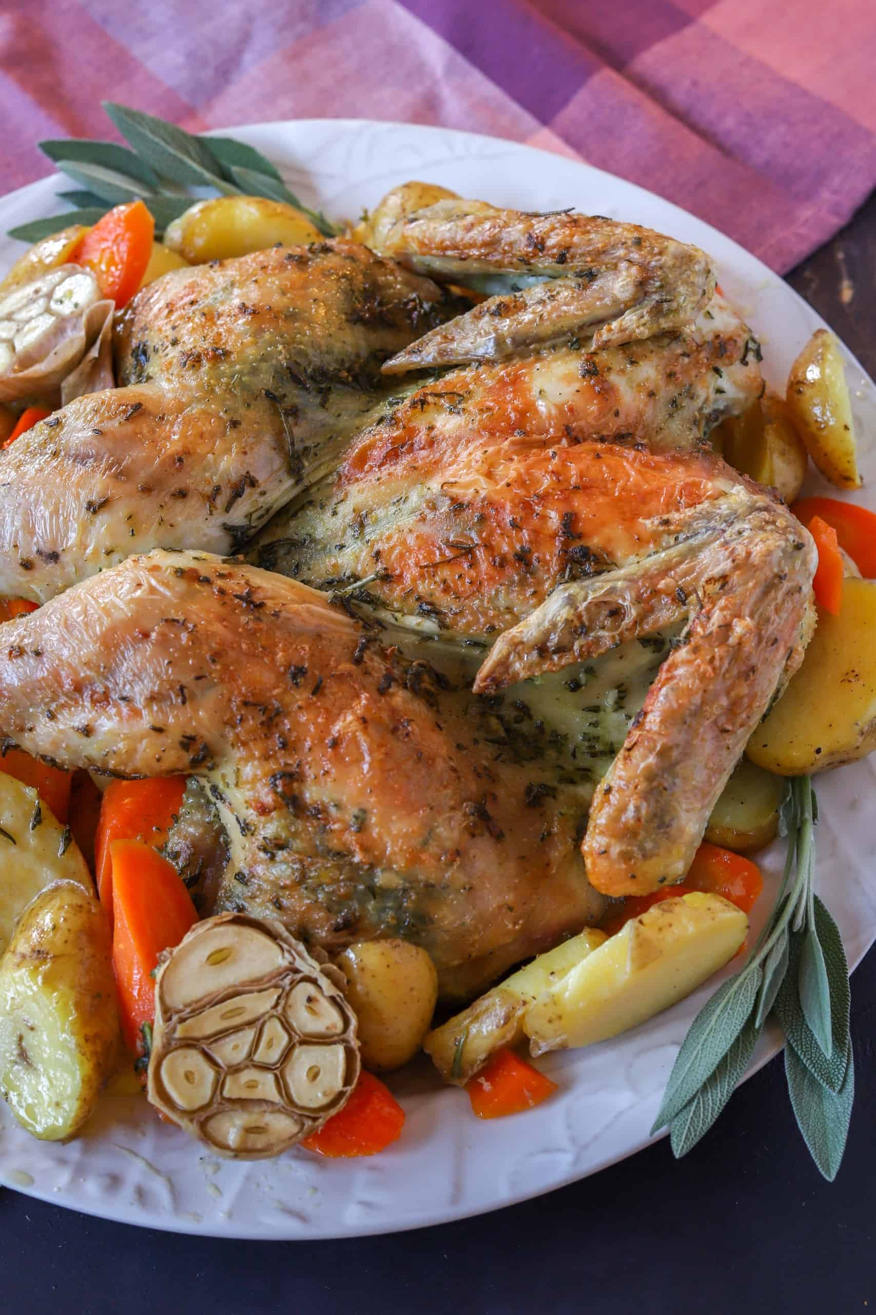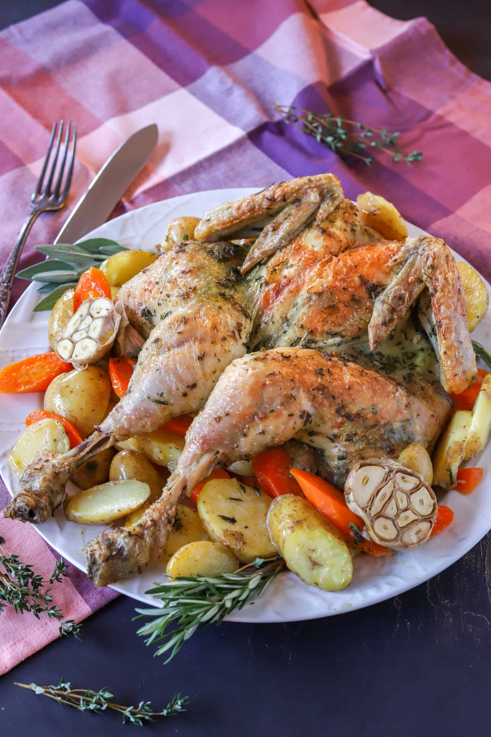 - Serveer de gevlinderde kip samen met de smaakvolle aardappels en wortels. De teentjes knoflook kun je uit de bol duwen en opkloppen met wat mayonaise voor bij de aardappels. Geniet van deze heerlijke kip!