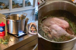- Pel de 4 teentjes knoflook en plet ze. Voeg ze samen met de rozemarijn, tijm en peperkorrels toe aan het pekelbad. Leg daarna de hele kip erin en zorg dat deze helemaal onder water ligt. Dek de pan af en zet 9 uur in de koelkast.