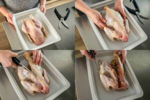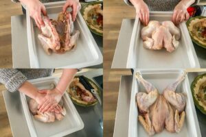 - Klap nu de kip open en draai ‘m weer om. Duw met je handen flink op de borst om ‘m helemaal open te klappen en zorg dat de kip zo plat mogelijk ligt. Nu ziet ‘ie eruit als een vlinder en dat verklaart gelijk de naam 'gevlinderde kip'.