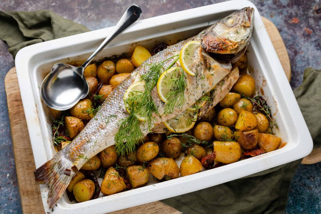 - Snijd de aardappels en wortels in grove plakken. Halveer de bol knoflook. Meng dit alles in het bakblik met een scheutje bakolijfolie en een snuf zout en gemalen zwarte peper.