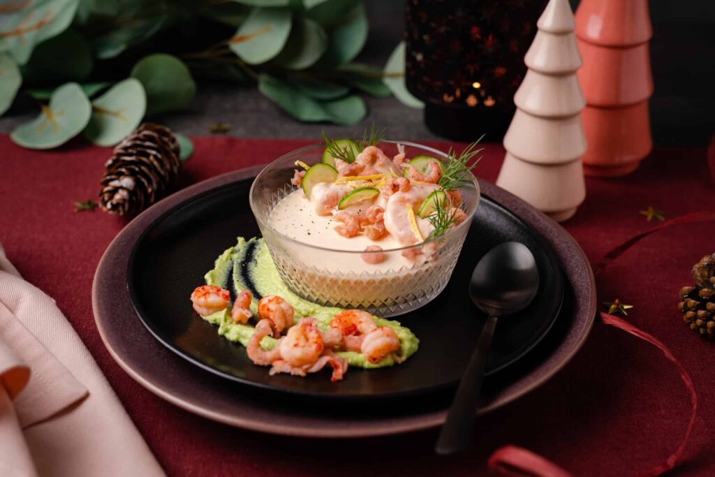 2. Meng in een schaal de Griekse yoghurt, 2 el citroensap, 1 tl citroenrasp, dille, garnalen en stukjes avocado. Breng op smaak met zout en peper en eventueel extra citroensap of -rasp.
