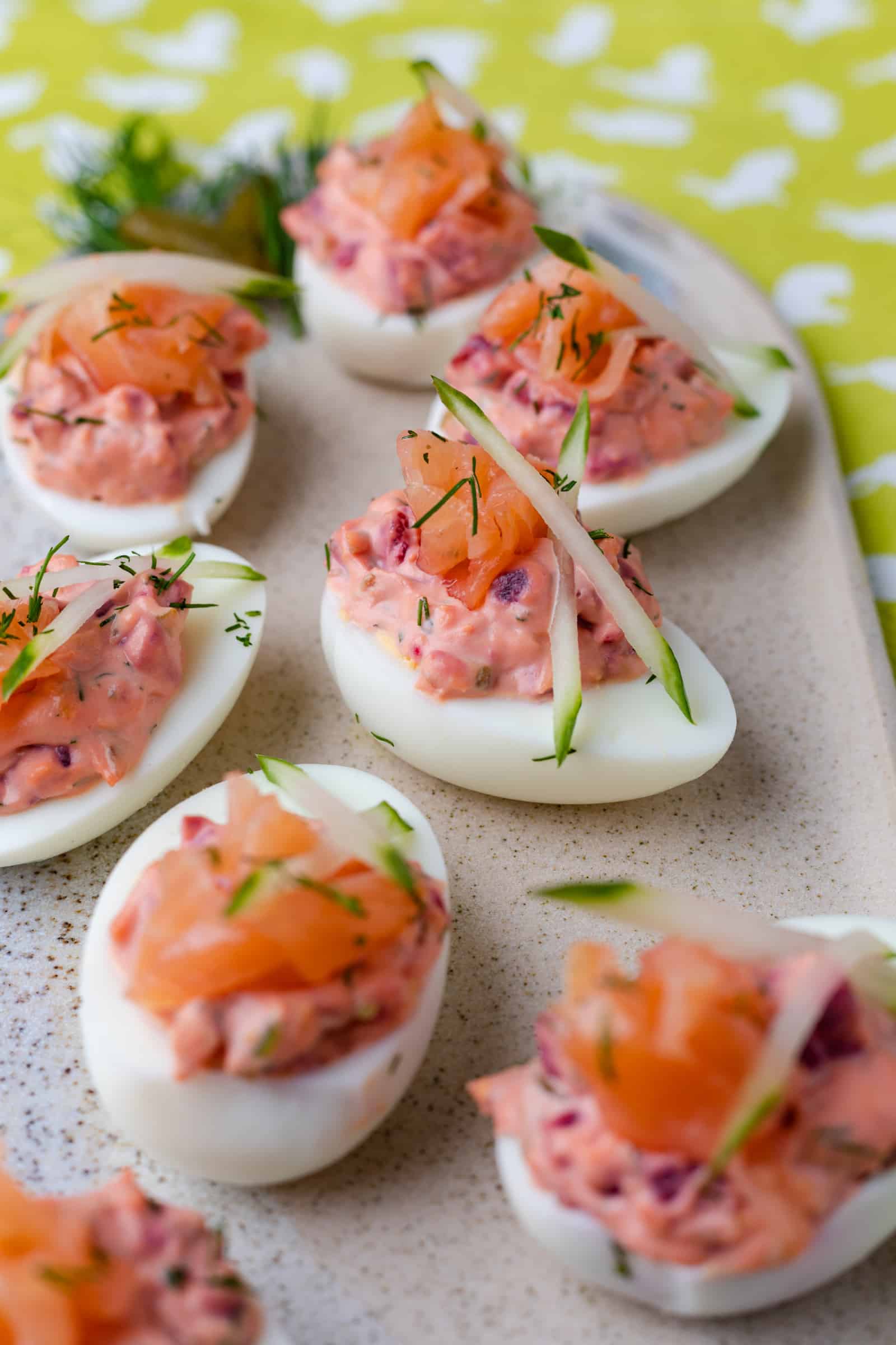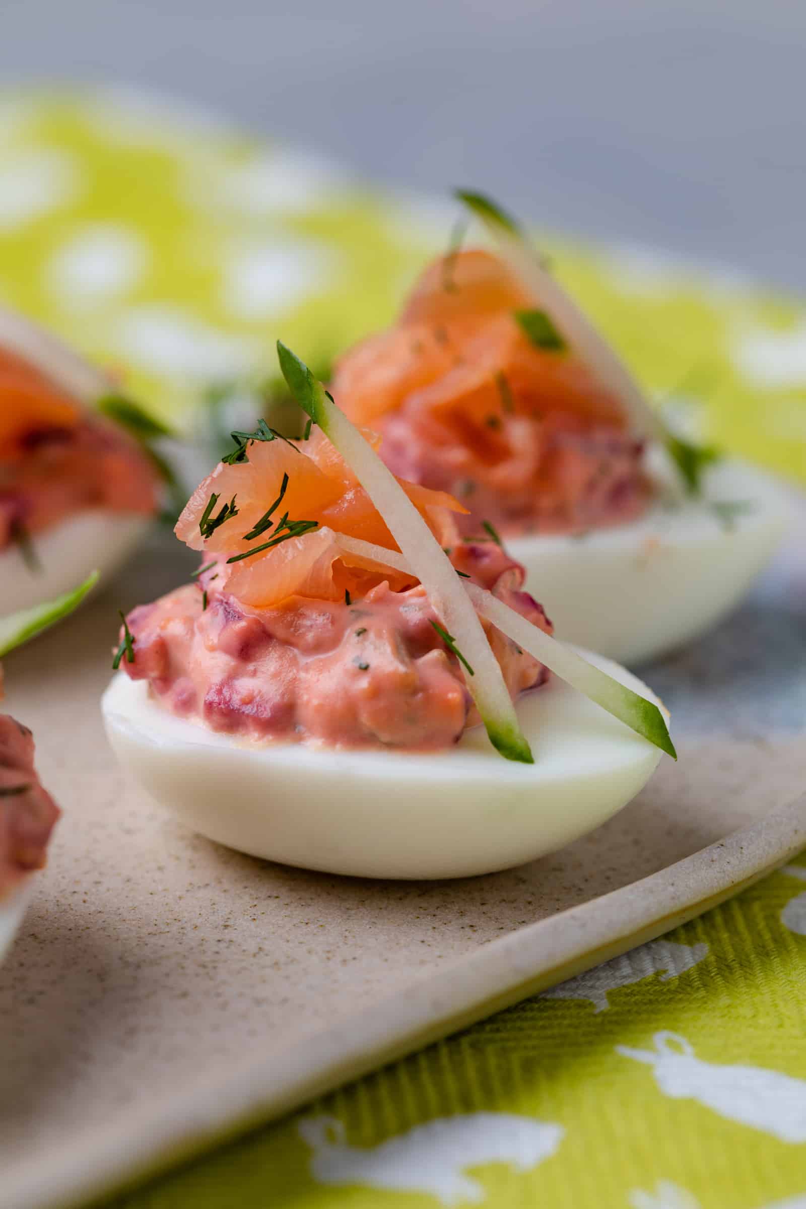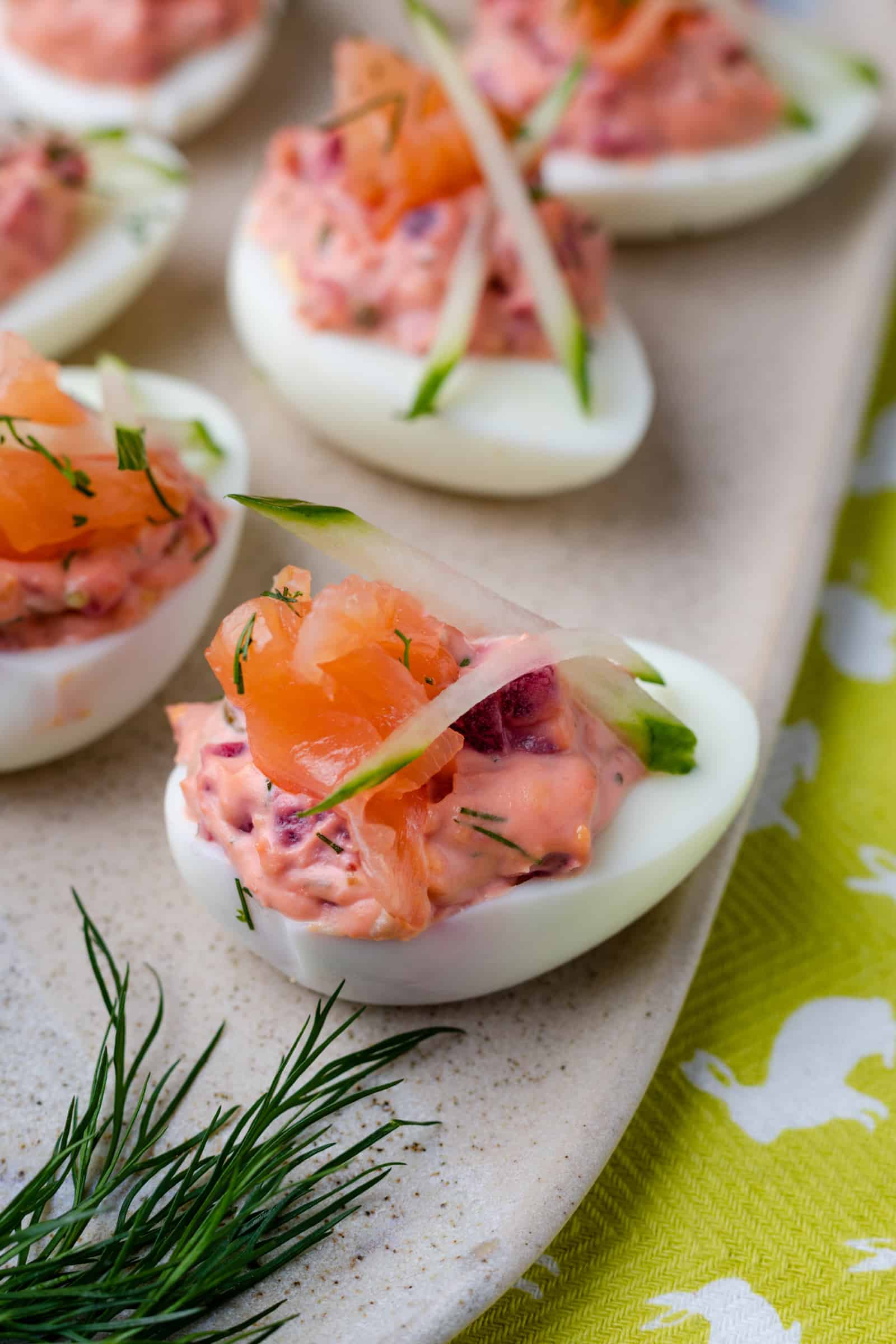 Nu Pasen weer begint te naderen, begin ik automatisch ook weer recepten met eieren te maken. Want een eitje hoort voor mij echt bij Pasen! En vandaag heb ik een heerlijk recept voor jullie in petto. Deze gevulde eieren met bietensalade en gerookte zalm zijn heel makkelijk om te maken en smaken zalig. En mooi meegenomen: als je de gerookte zalm weglaat ter garnering heb je een mooi vegetarisch hapje.