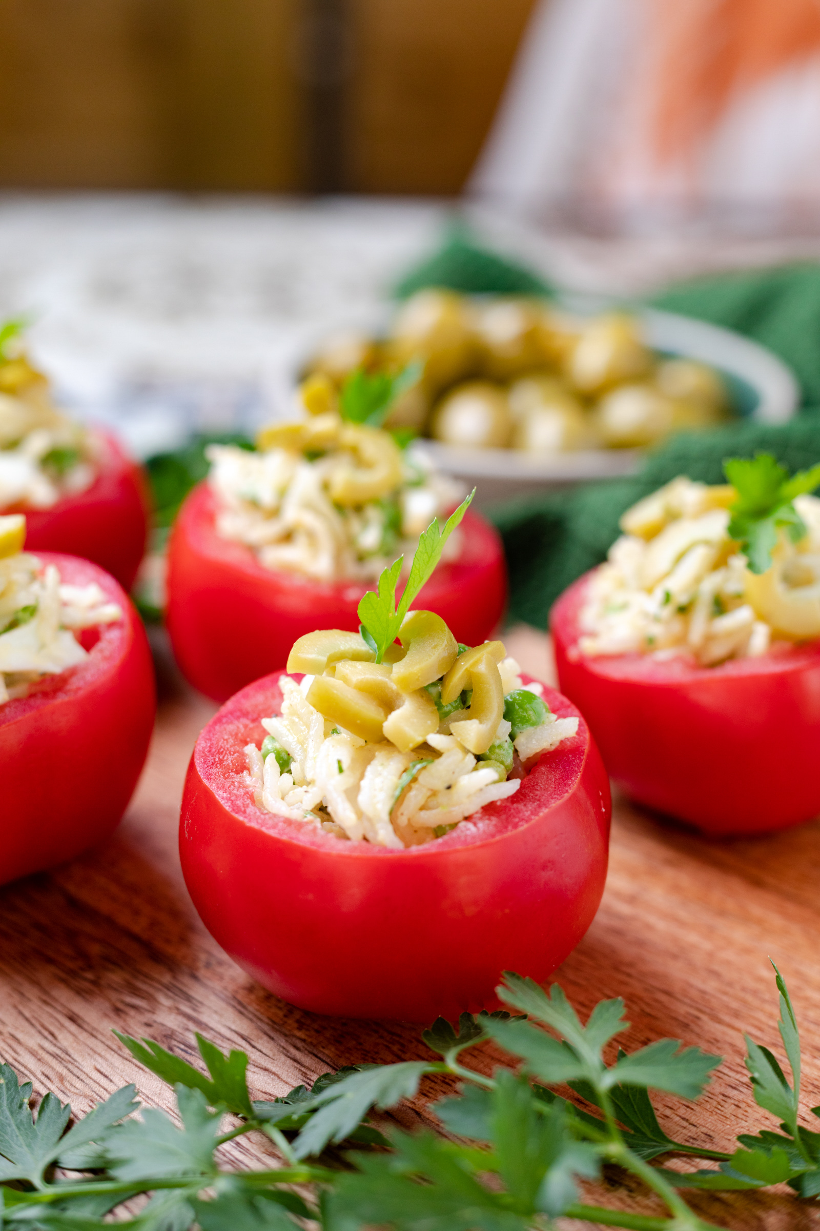 - Zet ze op een bordje en garneer iedere tomaat met wat ringetjes olijven en een takje peterselie.