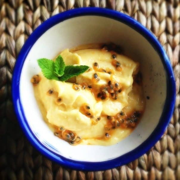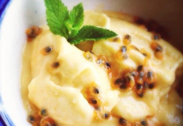 Serveer het ijs direct en garneer met passievrucht of ander fruit.