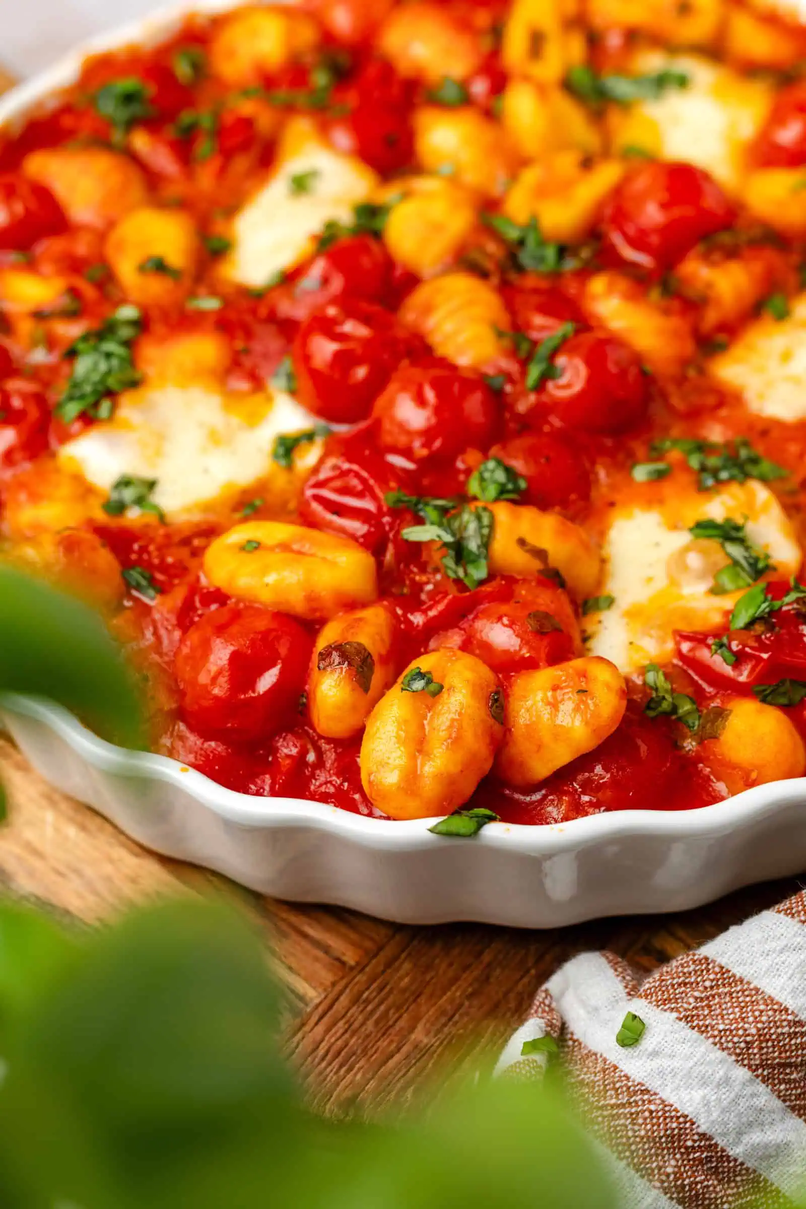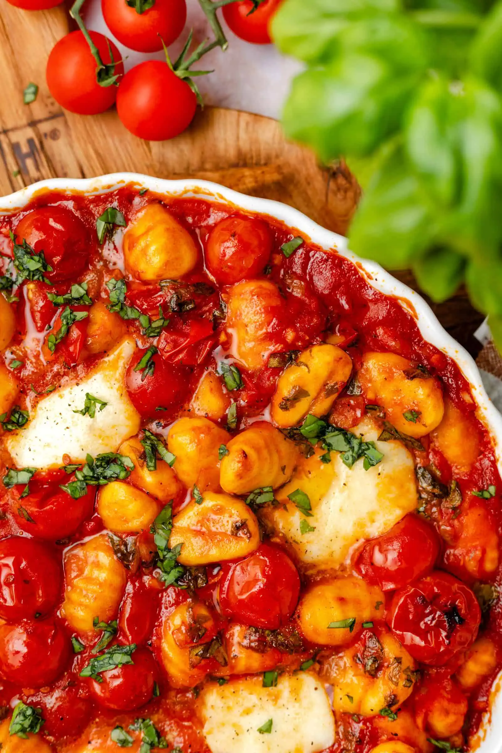 - Garneer de gnocchi alla sorrentina vanuit de oven met een snufje zwarte peper en wat extra fijngehakte basilicum. Serveer optioneel met Parmezaanse kaas en bijgerechten naar keuze.