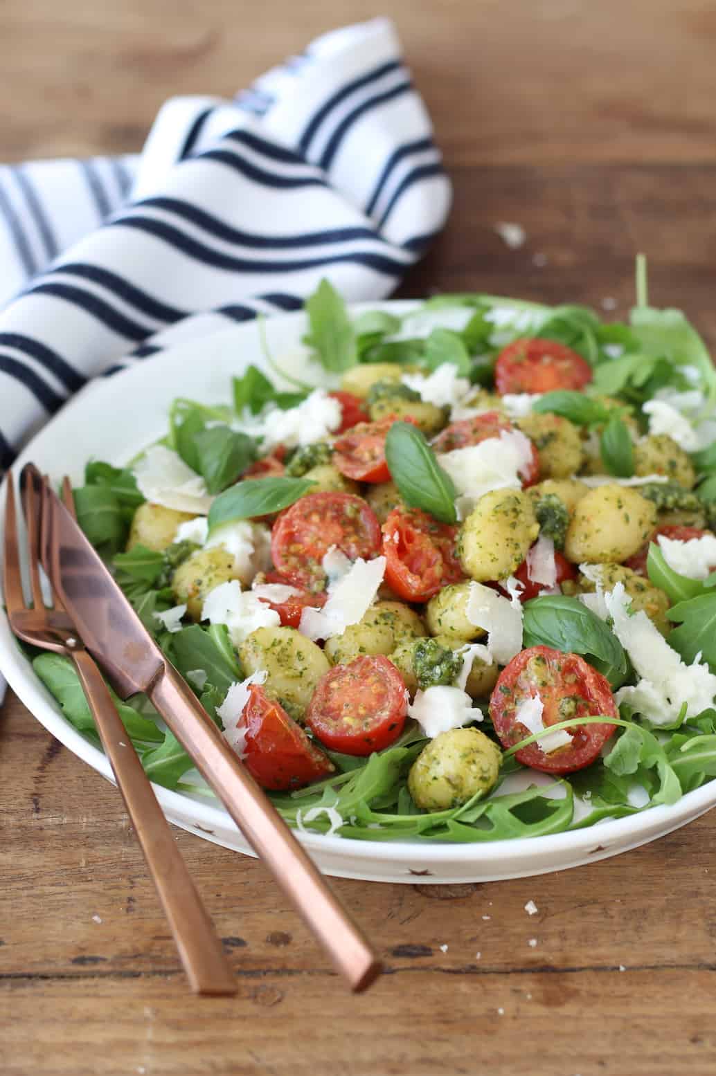 Op een doordeweekse avond wil je wel lekker en gezond eten, maar niet te lang in de keuken staan. Dan is dit overheerlijke recept ideaal! Heerlijke pure smaken van pesto en tomaat, gecombineerd met romige mozzarella en natuurlijk gnocchi. Ik krijg alweer trek in deze gnocchi met pesto als ik eraan denk.