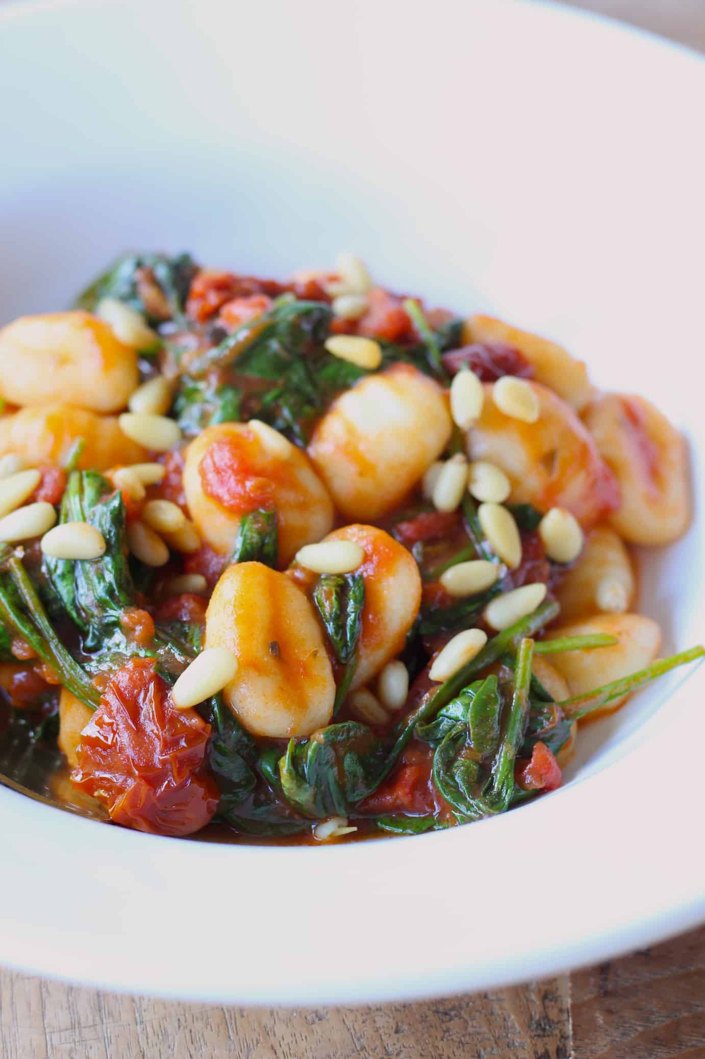 Deze heerlijke gnocchi met spinazie en zongedroogde tomaat is typisch een fijn gerecht voor de maandag. Vegetarisch, snel te bereiden, lekker voor het hele gezin en je wordt er blij van. Tenminste, ik word altijd heel erg blij van gnocchi.