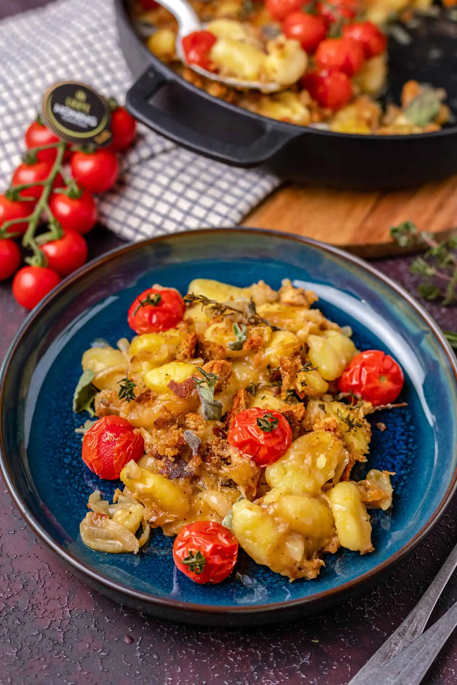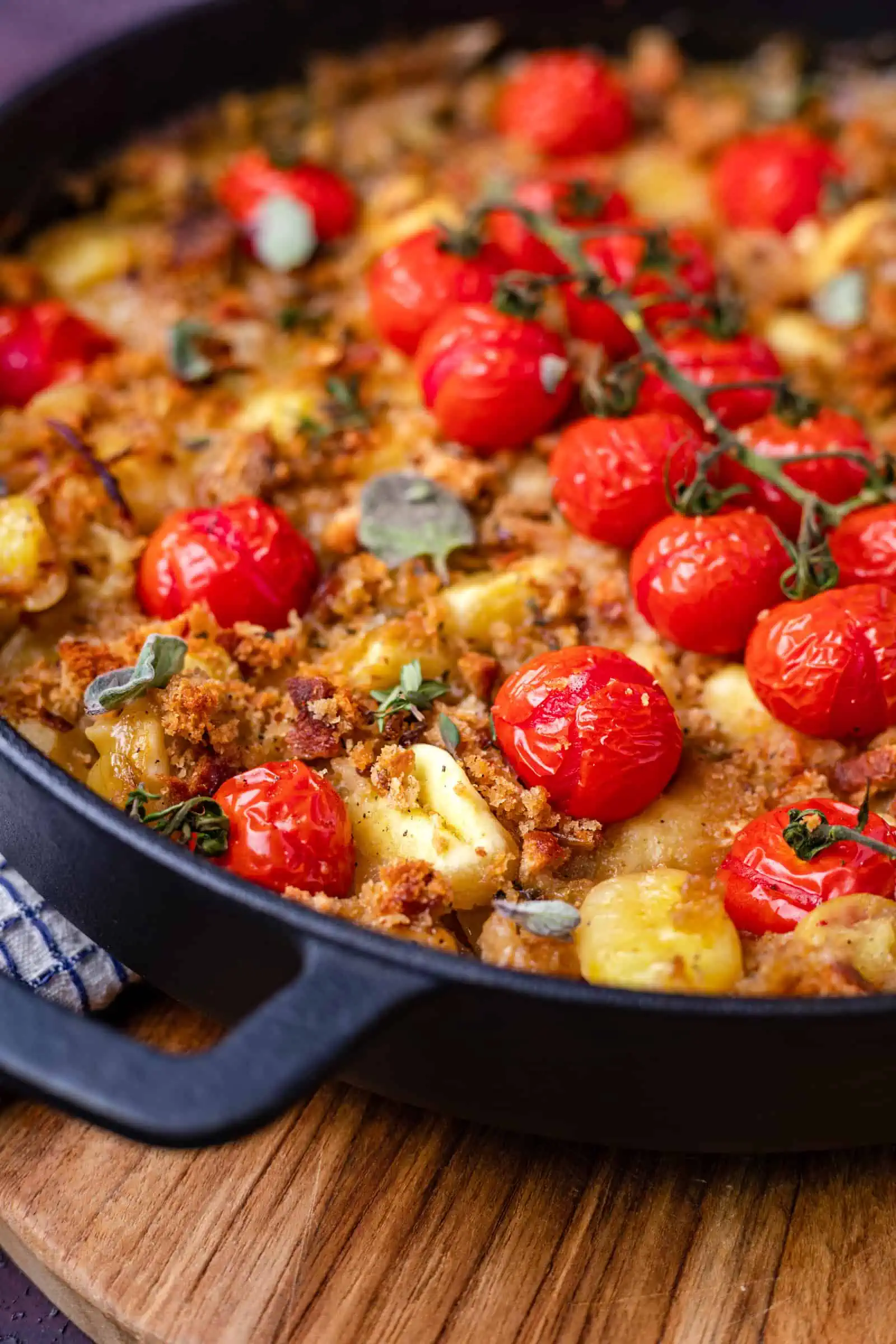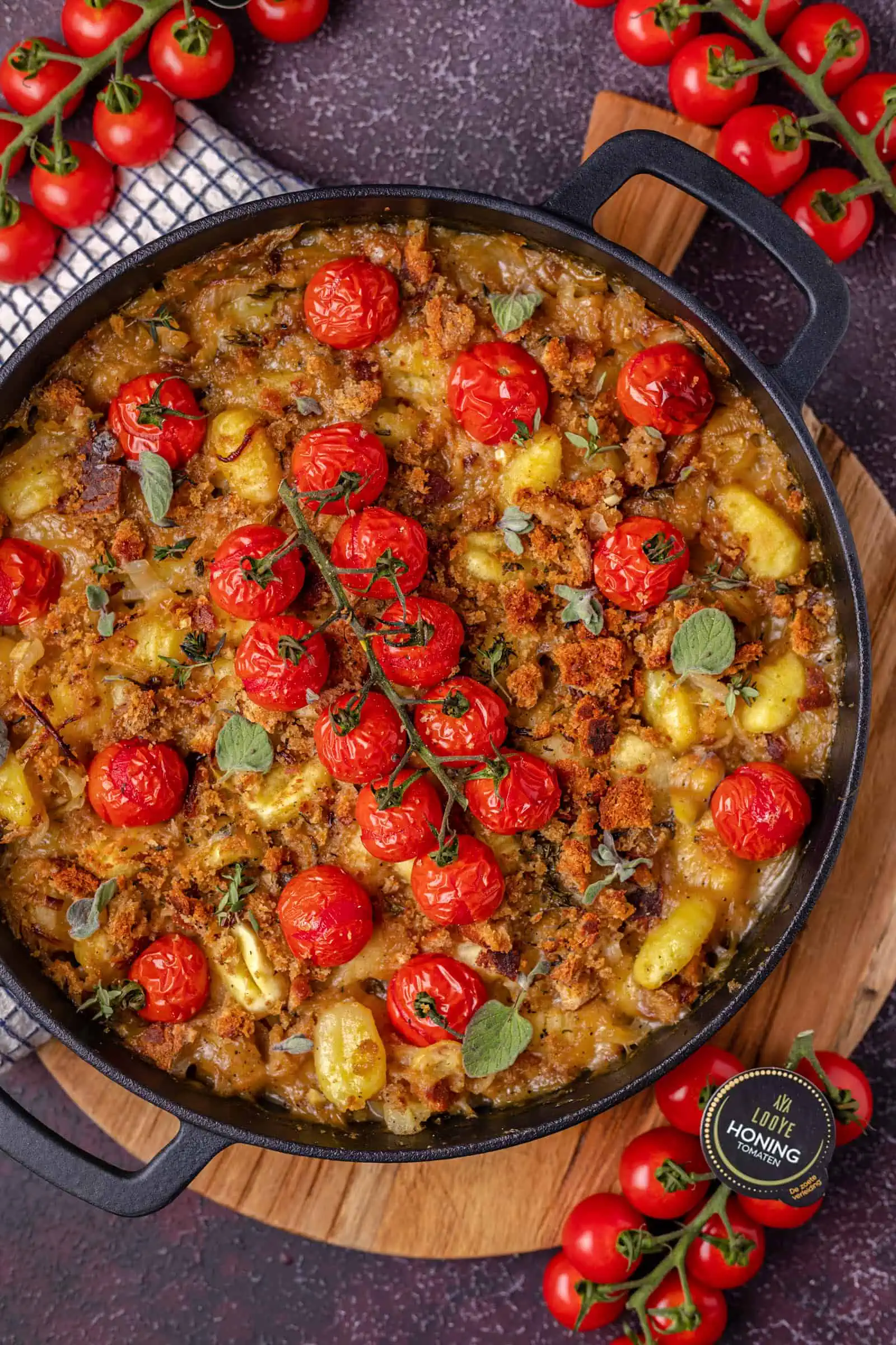 - Strooi na 25 minuten de broodkruimels over de gnocchi en verdeel de honingtomaten erover. Zet nog 5 minuten in de oven en check of de saus goed gebonden is (gaat vanzelf door het zetmeel van de gnocchi). Zo niet: dan heeft de gnocchi nog 5 – 10 minuten nodig. Zet op het laatst de grill nog even aan voor een mooi bruin korstje.