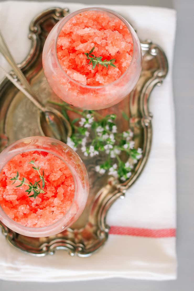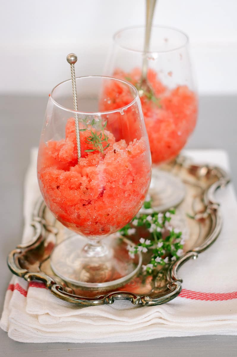 - Serveer de granita met watermeloen en vlierbloesem in mooie glazen met wat extra tijmblaadjes en wat stukjes watermeloen.