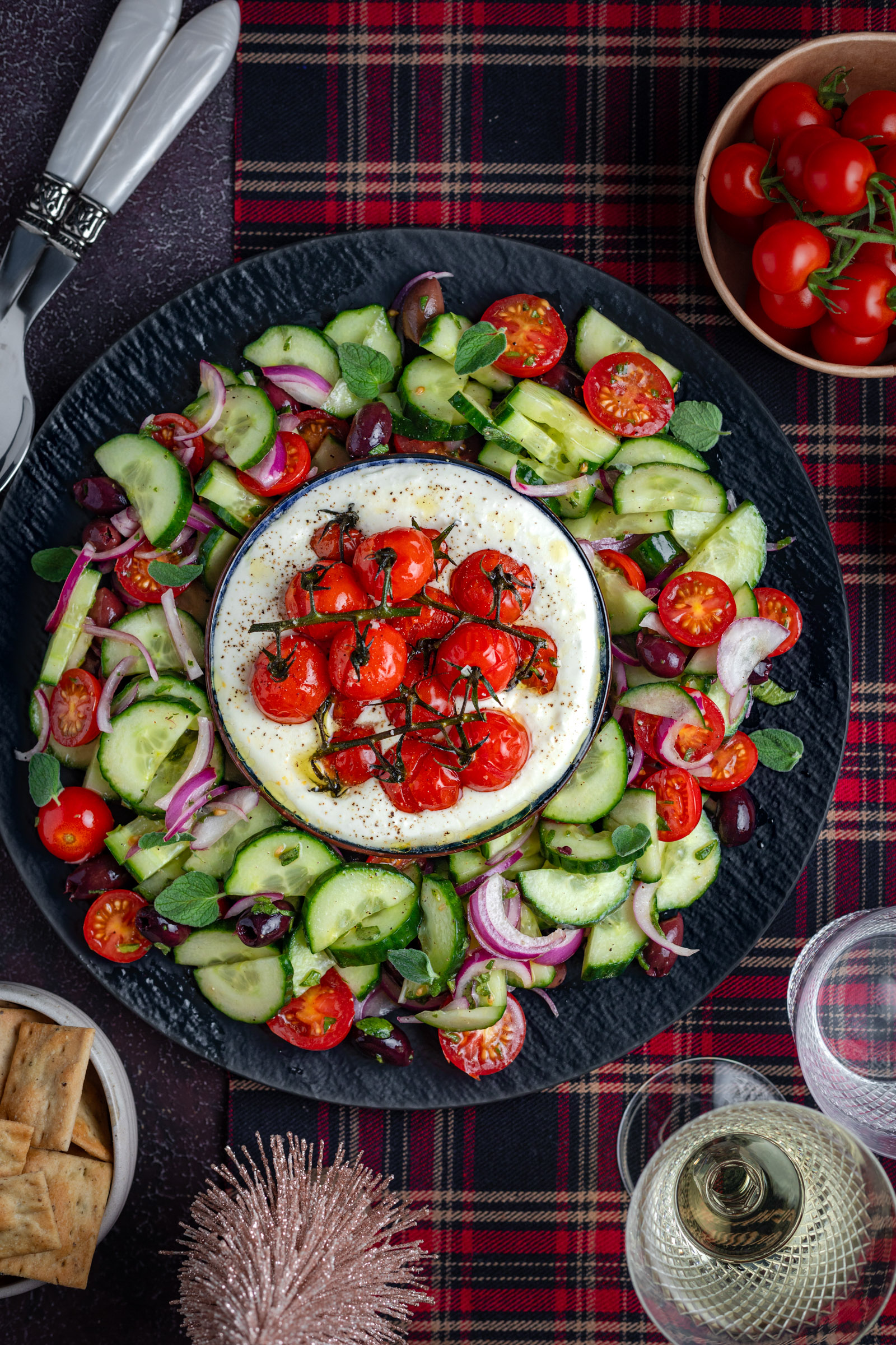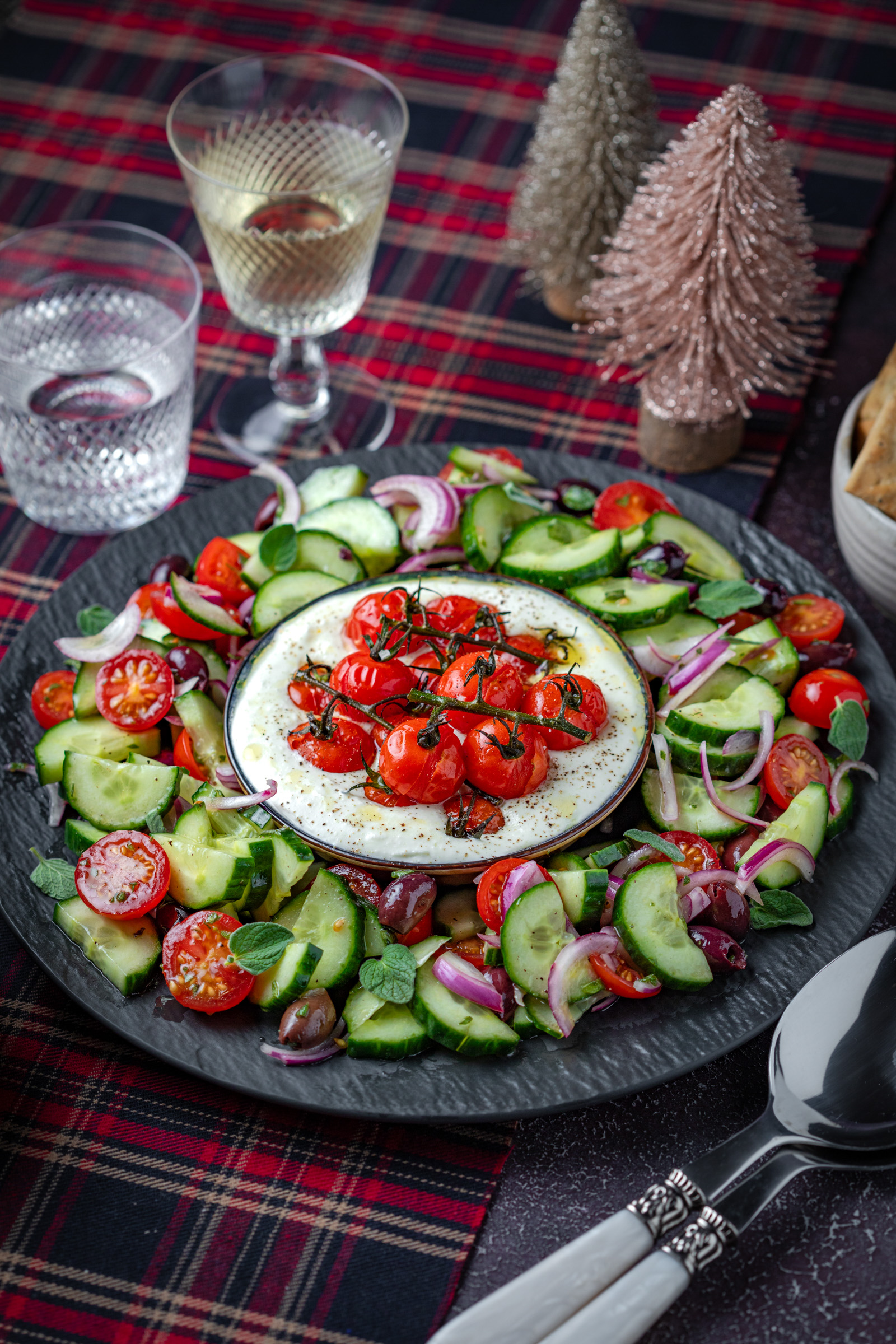 Samenwerking – Deze klassieke Griekse kerstsalade heb ik in een feestelijk jasje gestoken, perfect voor de kerstbrunch! De smaken van frisse komkommer, ingelegde rode ui, kalamata olijven en verse oregano combineren prachtig met de romige opgeklopte feta, die ik extra smaakvol maak met een vleugje knoflookolie. De ster van het gerecht? De geroosterde Looye Honingtomaten, die zorgen voor een zoete, zachte smaakexplosie.