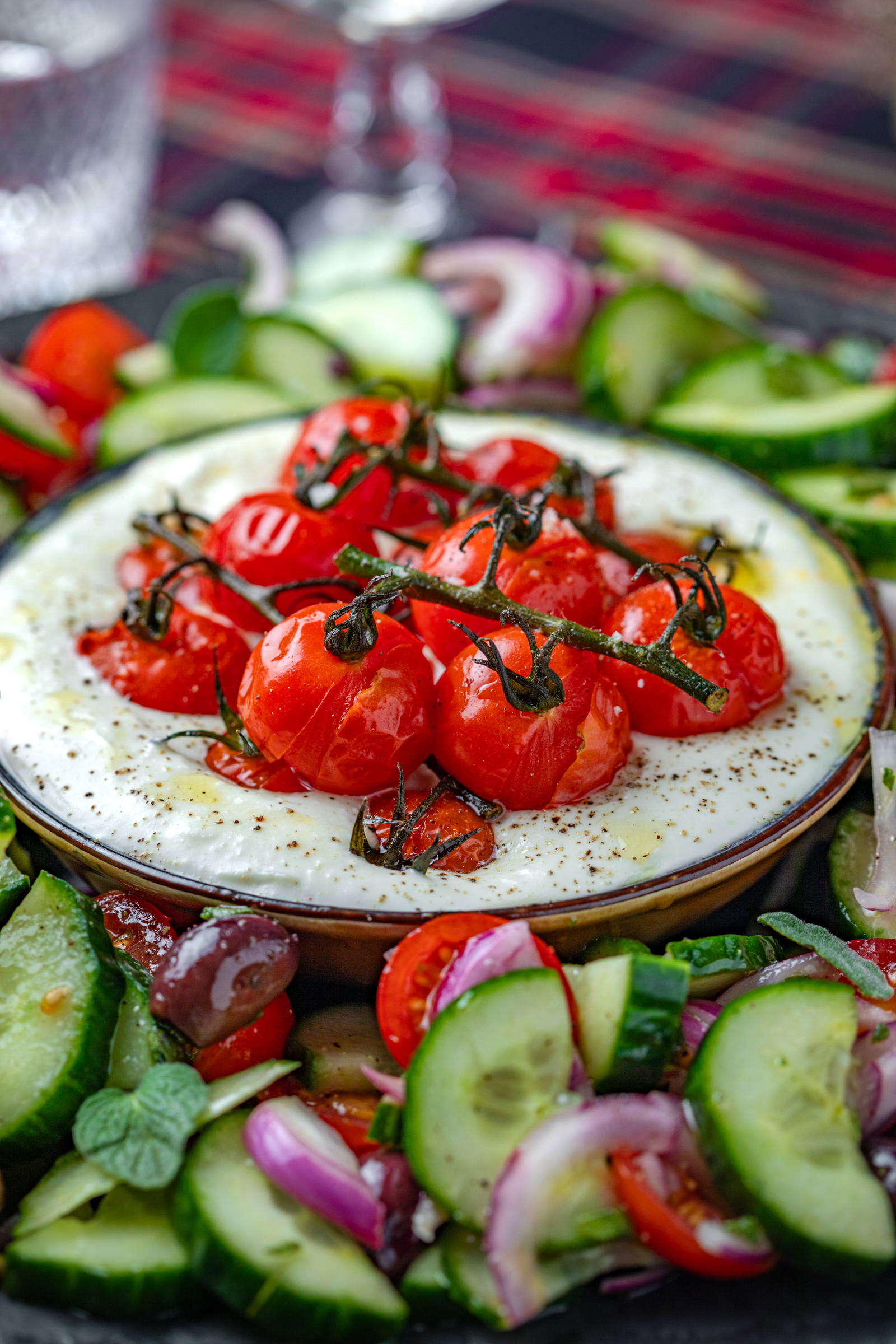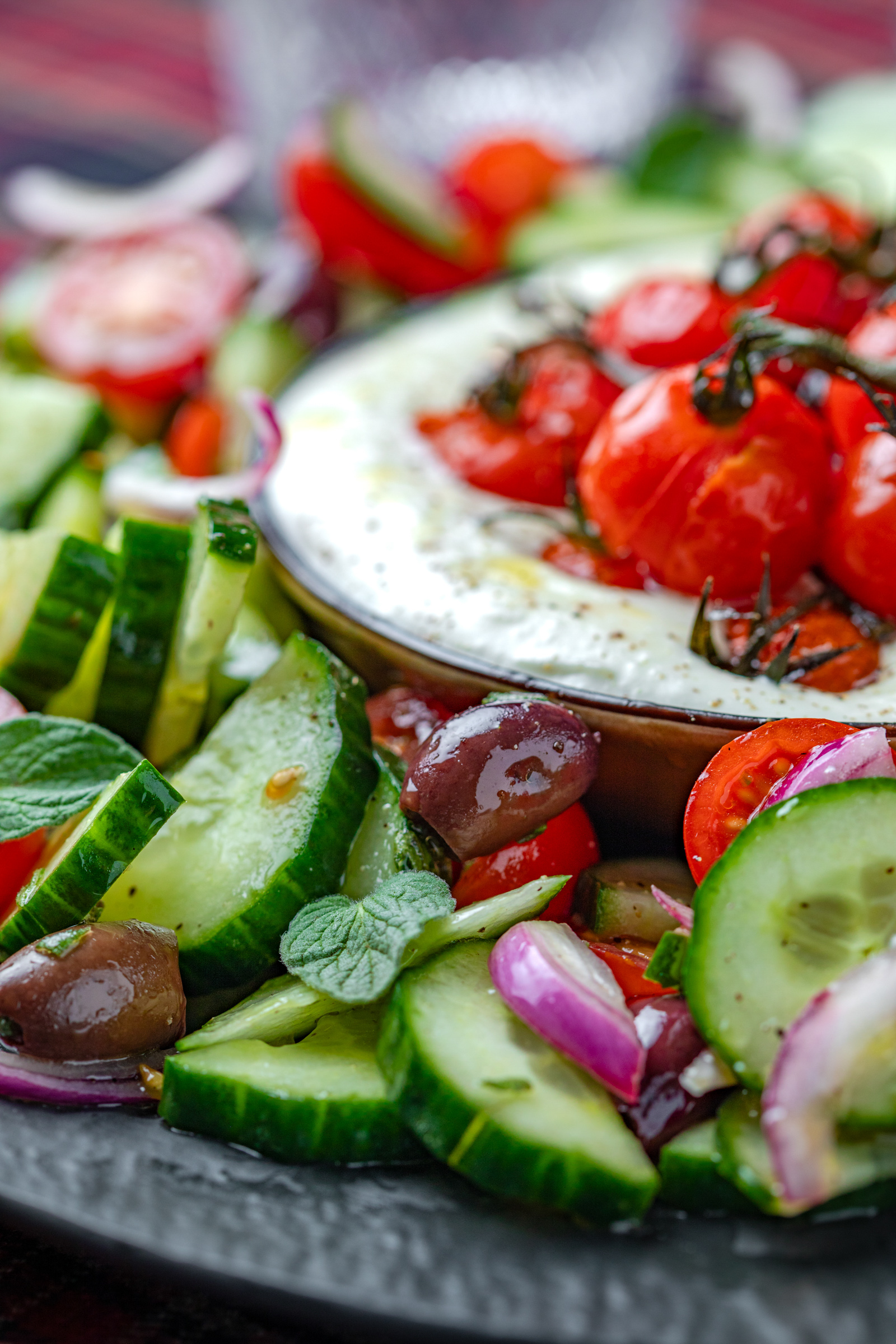 - Combineer de komkommer, olijven, gehalveerde Looye Honingtomaten, ingelegde rode ui en fijngehakte oregano in een kom samen met een royale scheut olijfolie, sap van ½ citroen, peper en zout. Meng goed en proef, breng naar wens verder op smaak.