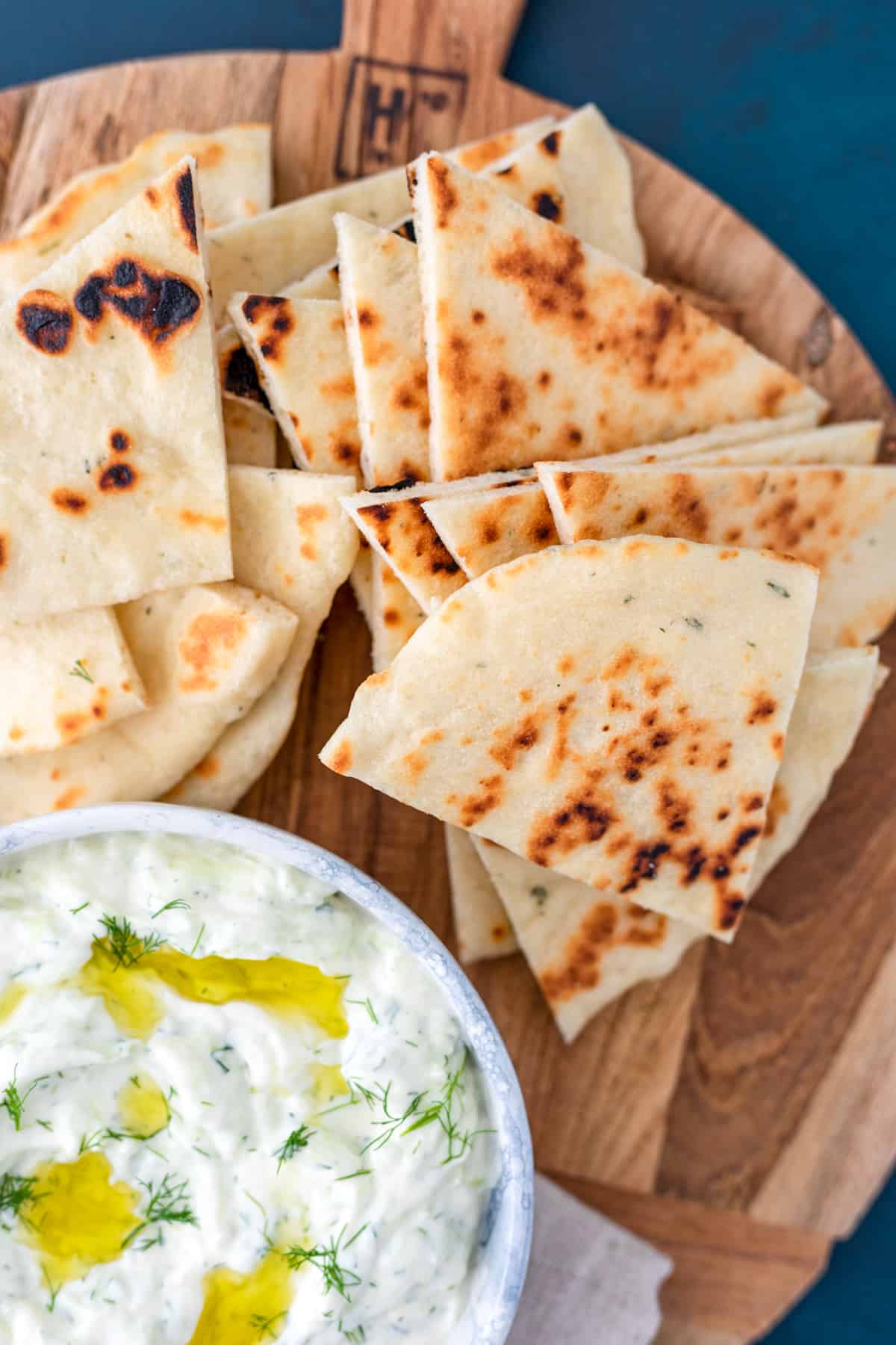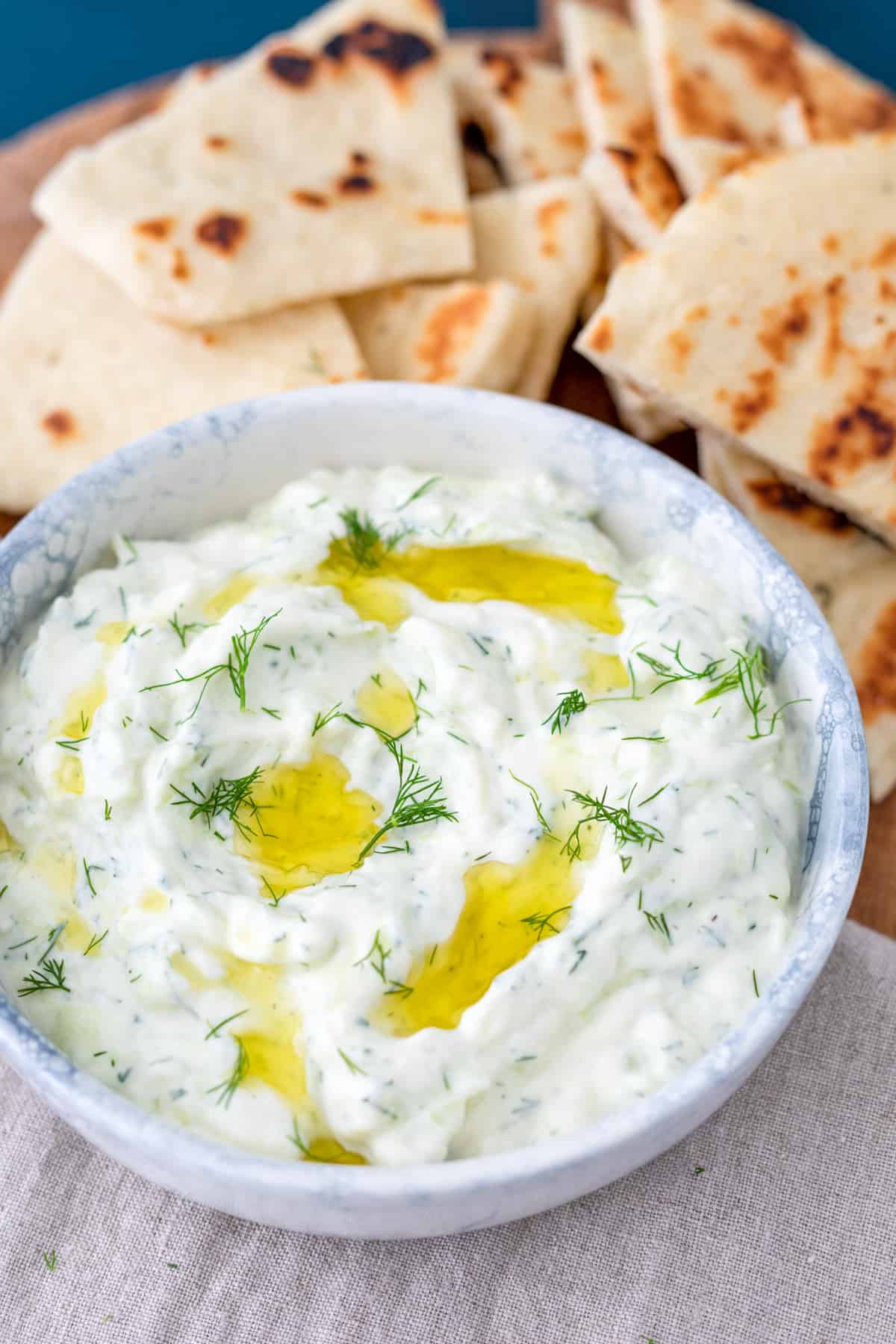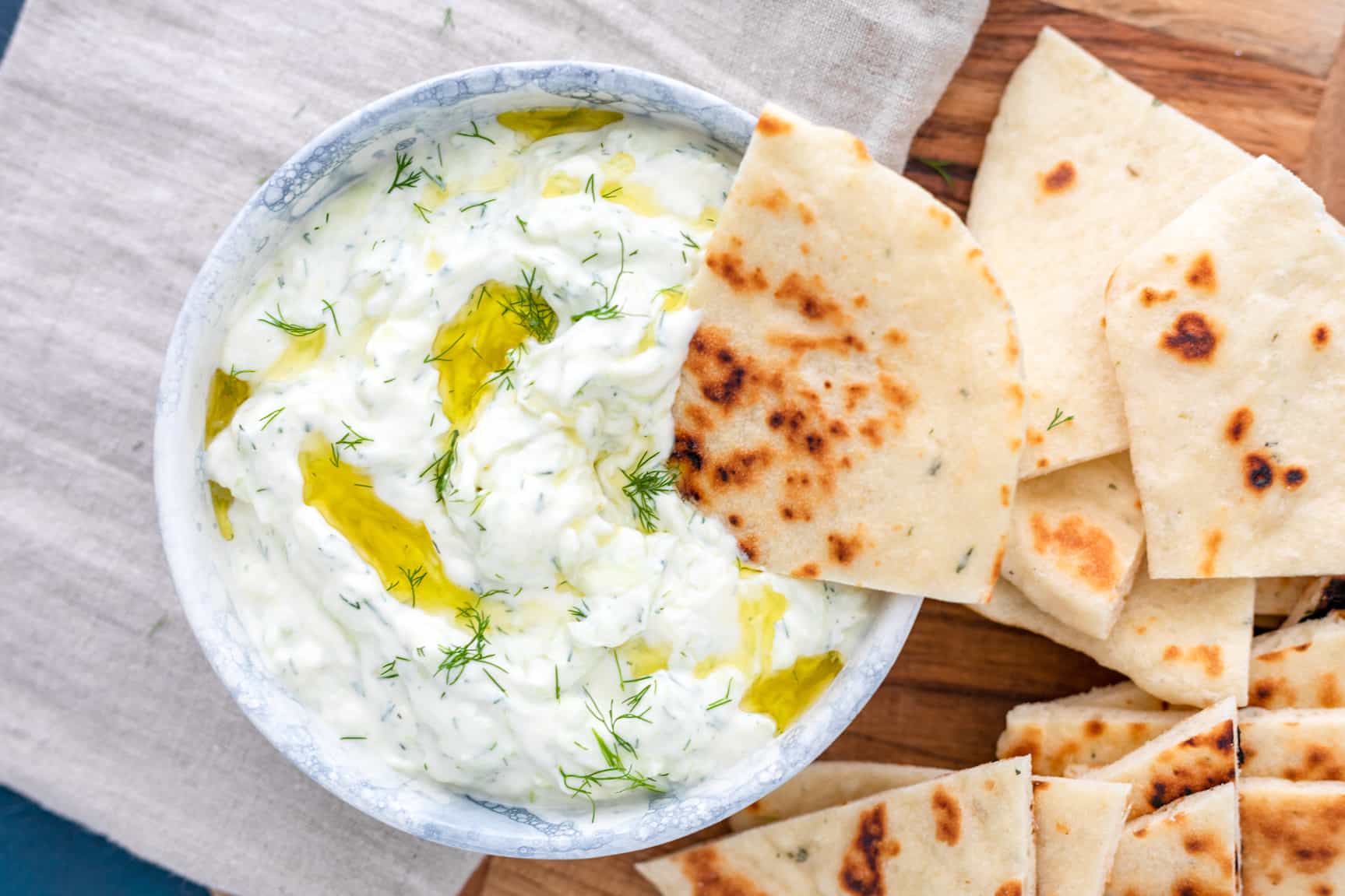 - Serveer de tzatziki in een mooi bakje en schenk er nog wat druppeltjes olijfolie op. Serveer met de Griekse pita's of ander brood.