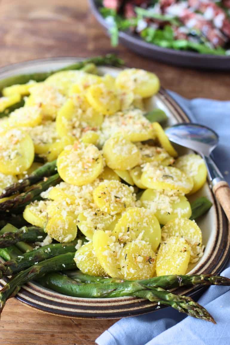 Maar je kunt ‘m ook heel goed serveren bij geroosterde kip of gebakken vis, een multifunctioneel bijgerecht dus. Gebruik hiervoor wel voorgegaarde schijfjes aardappel, want anders heeft de aardappel meer tijd nodig dan de groene asperges waardoor die dan weer veel te zacht worden en dat is zonde.