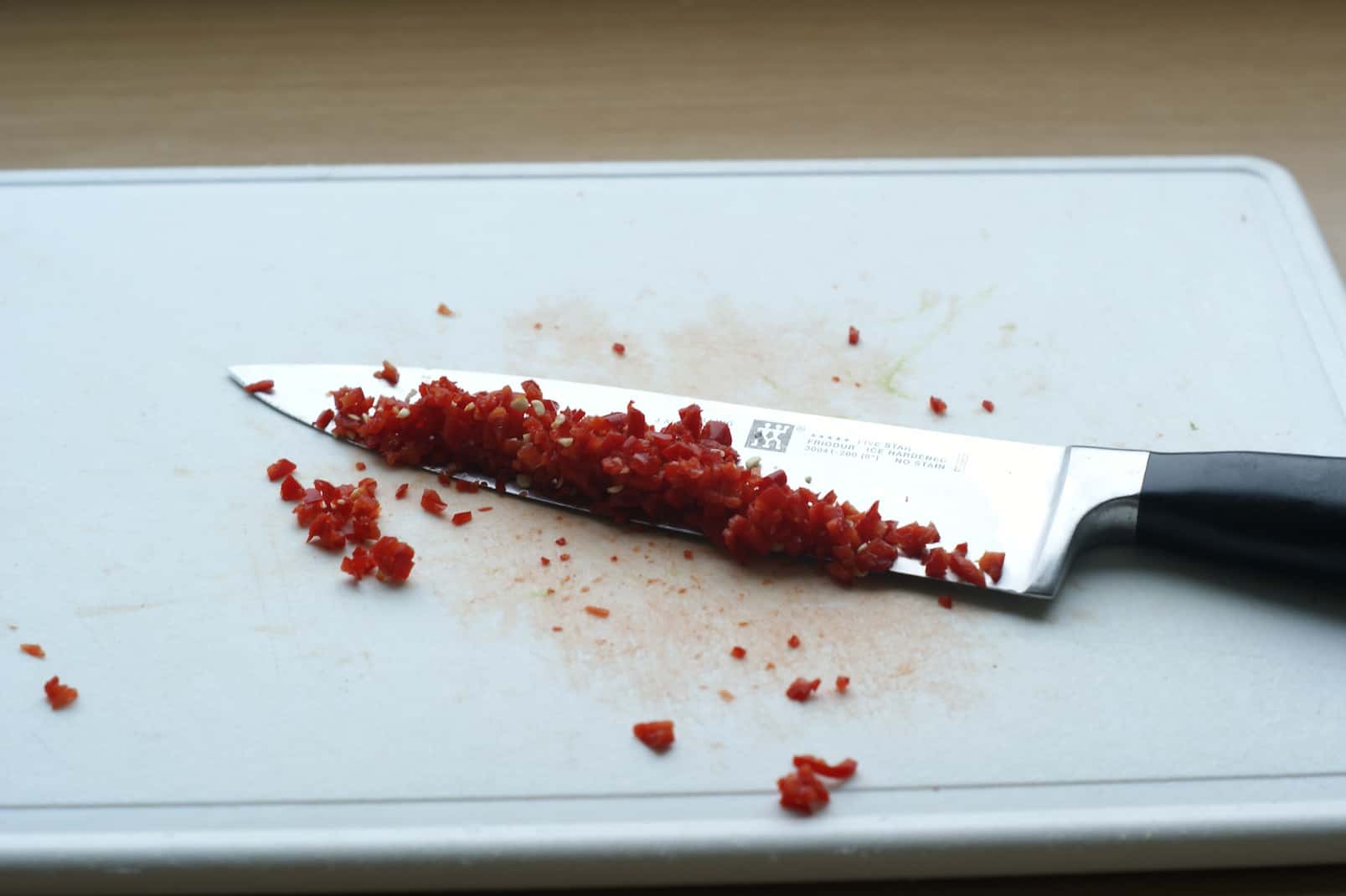 Snipper de sjalot fijn en doe dit in een mengkom waarin je lekker kunt prakken. Het rode pepertje kan met of zonder zaadjes worden gebruikt, dit is echt afhankelijk van je eigen smaak en hoe pittig het pepertje is. Hak het pepertje zo fijn mogelijk en voeg de helft toe, je kunt altijd na het proeven besluiten dat de andere helft er ook nog bij mag!