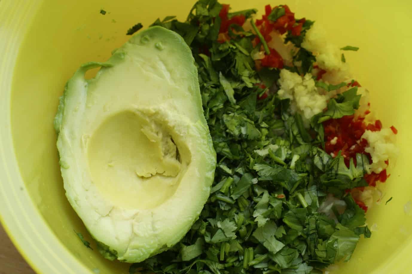 Het is het handigst om alle ingrediënten gesneden te hebben voordat de avocado’s worden geschild. Deze worden namelijk snel bruin en door het limoensap – zie laatste stap hieronder – voorkom je dit.