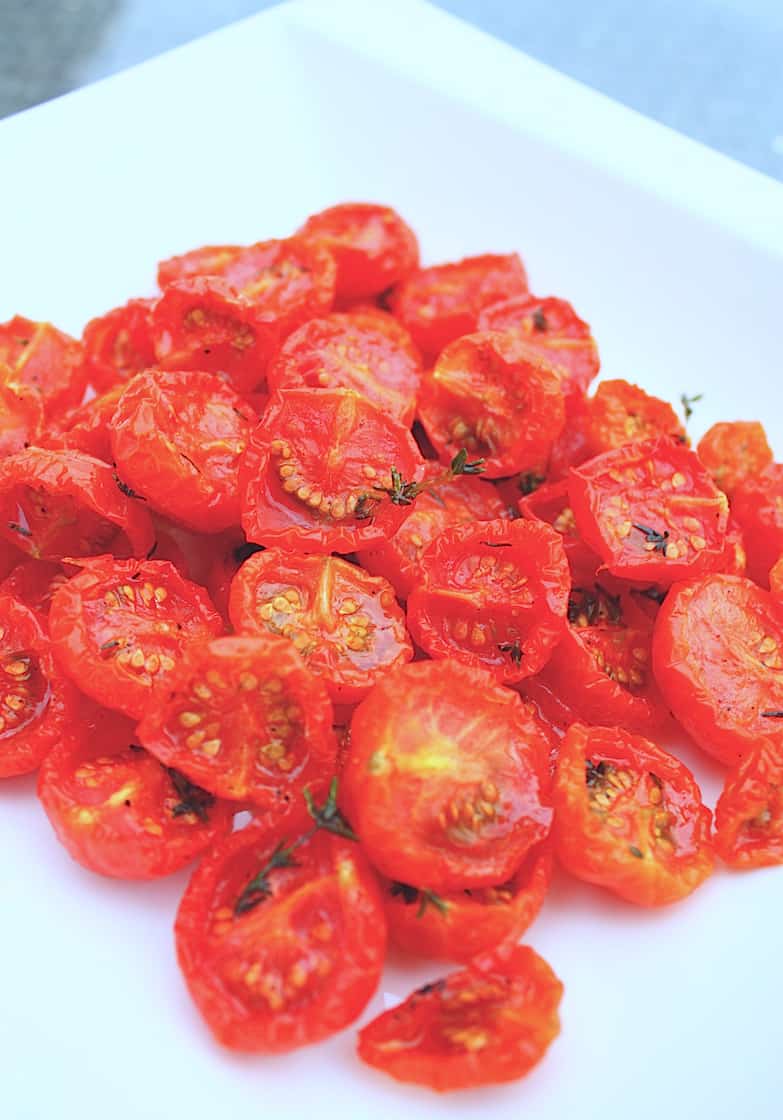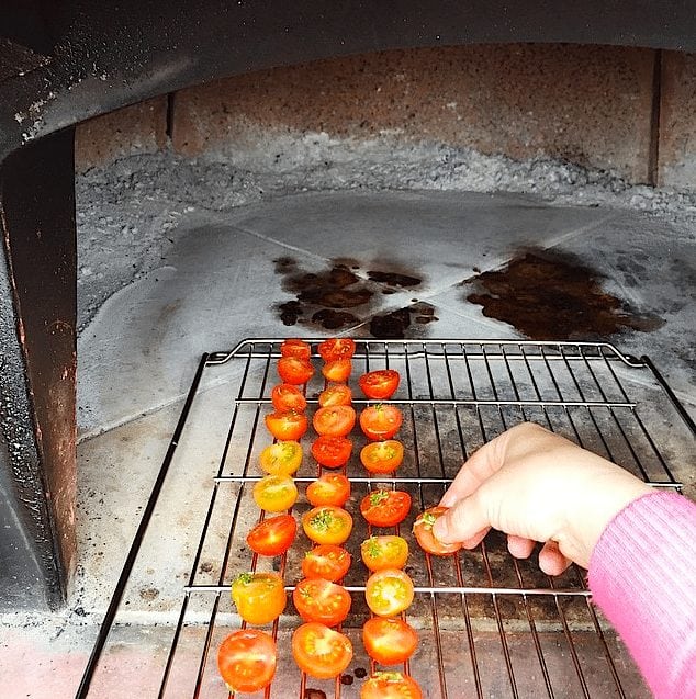 Jaren geleden zag ik Nigella Lawson een keer tomaatjes in een hete oven schuiven vlak voordat ze naar bed ging. De volgende ochtend haalde ze prachtige, halfgedroogde exemplaren eruit zonder dat de oven ‘s nachts had aangestaan. Die methode is ergens in mijn achterhoofd blijven sudderen totdat ik eerder dit jaar in Frankrijk was en daar een hete pizzaoven tot mijn beschikking had die net zijn werk had gedaan. Ik pakte een rek, deed daar de tomaatjes op, ging naar bed en wandelde ‘s ochtends in de Franse ochtendzon erheen. Het resultaat? Halfgedroogde tomaatjes, droog aan de buitenkant en nog sappig van binnen. Vol van smaak en heerlijk voor vele toepassingen. In de salade, op een broodje met kaas of door de pasta. Ze waren binnen no time op.