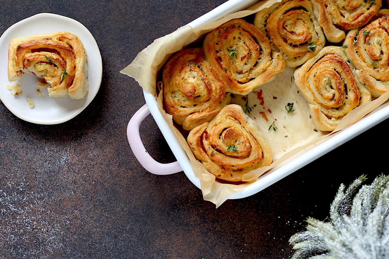 - Snijd 10 rolletjes van het opgerolde pizzadeeg en leg deze naast elkaar in de ovenschaal met de snijkanten naar boven.
