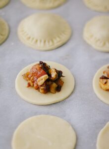 - Herhaal dit met al het deeg en bestrijk de hand pies met losgeklopt ei. Maak er met een scherp mes een kruis in zodat de stoom kan ontsnappen.
