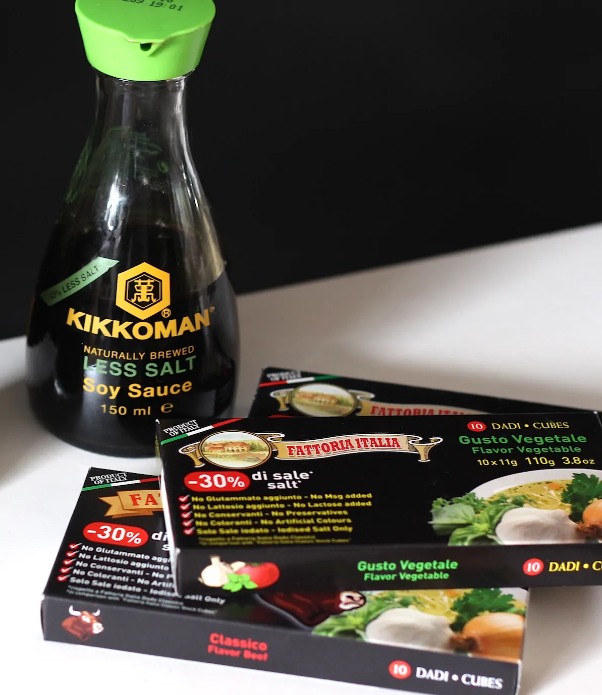 Bouillonblokjes en sojasaus, zomaar twee voorbeelden van producten die zeer veel zout bevatten. Zo heb ik de bouillonblokjes thuis vervangen door de blokjes van Fattoria Italia die 30% minder zout bevatten en daarnaast ook nog eens vrij zijn van smaakversterkers en andere kunstmatige toevoegingen. Dat zijn twee vliegen in een klap. Qua sojasaus gebruik ik Kikkoman ‘less salt’ die 43% minder zout bevat zonder dat het, wat mij betreft, de smaak aantast.